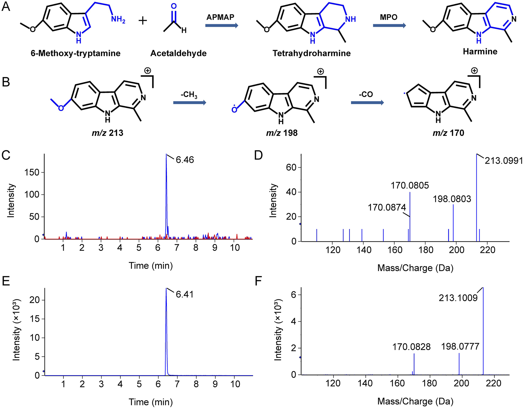 Figure 3. LC-MS/MS identification of products formed from the incubation of aldehyde and amine with APMAP and MPO. (A) Schematic representation of the reaction between 6-methoxytryptamine and acetaldehyde under the catalysis of APMAP and MPO. (B) Schematic illustration of the fragmentation of harmine. The XIC (C) and secondary ion fragments spectrum (D) of a reaction product with the molecular formula C13H12N2O. The XIC (E) and secondary ion fragments spectrum (F) of harmine standard.