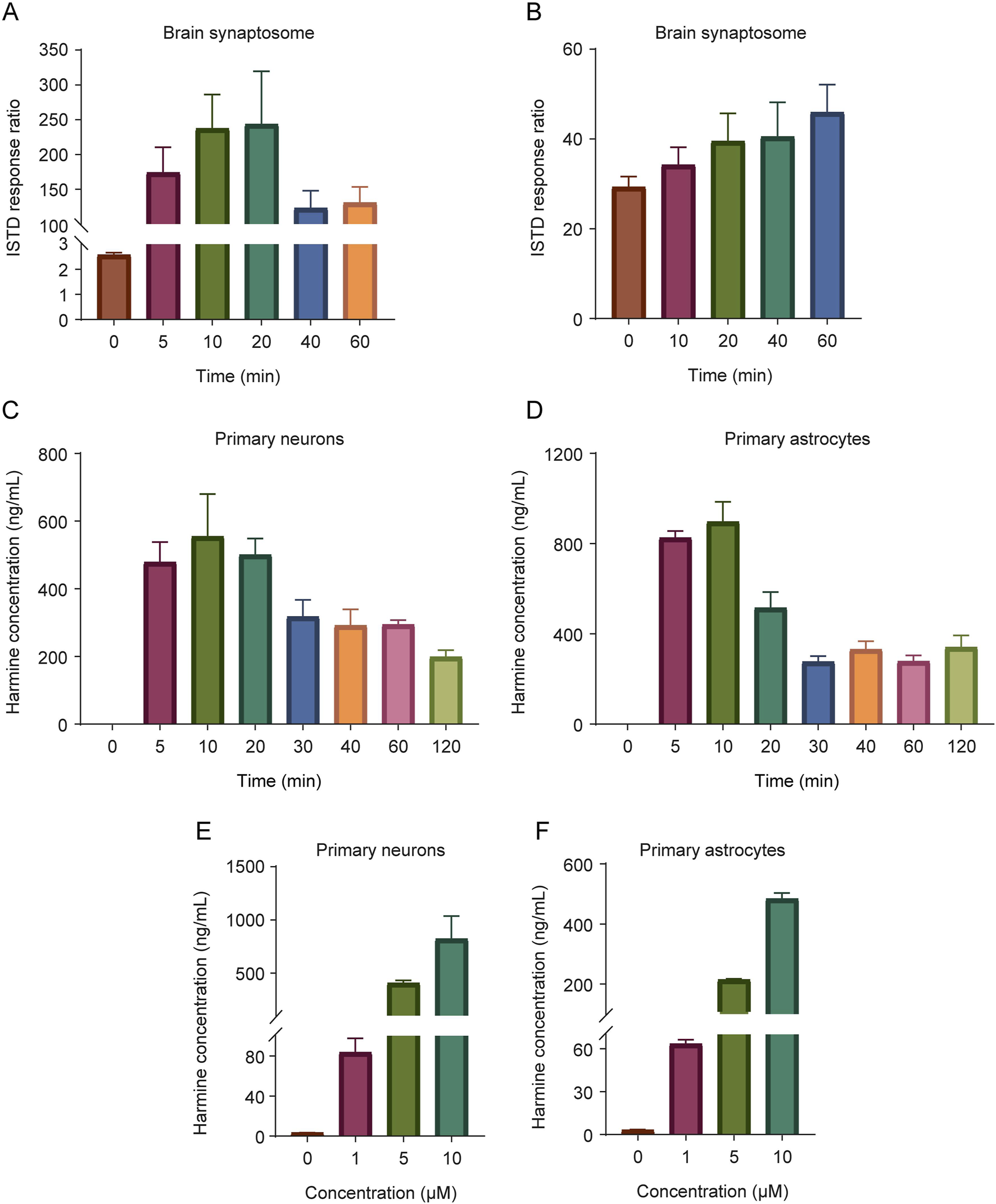Figure 4. The uptake and release of harmine in the synaptosomes and primary neural cells. The uptake (A) and release (B) of harmine in brain synaptosomes. (C) The uptake of harmine in primary neurons. (D) The uptake of harmine in primary astrocytes. (E) The effect of harmine concentration on the uptake of harmine in primary neurons. (F) The effect of harmine concentration on the uptake of harmine in primary astrocytes. Data were presented as mean ± SD, n = 3/group.