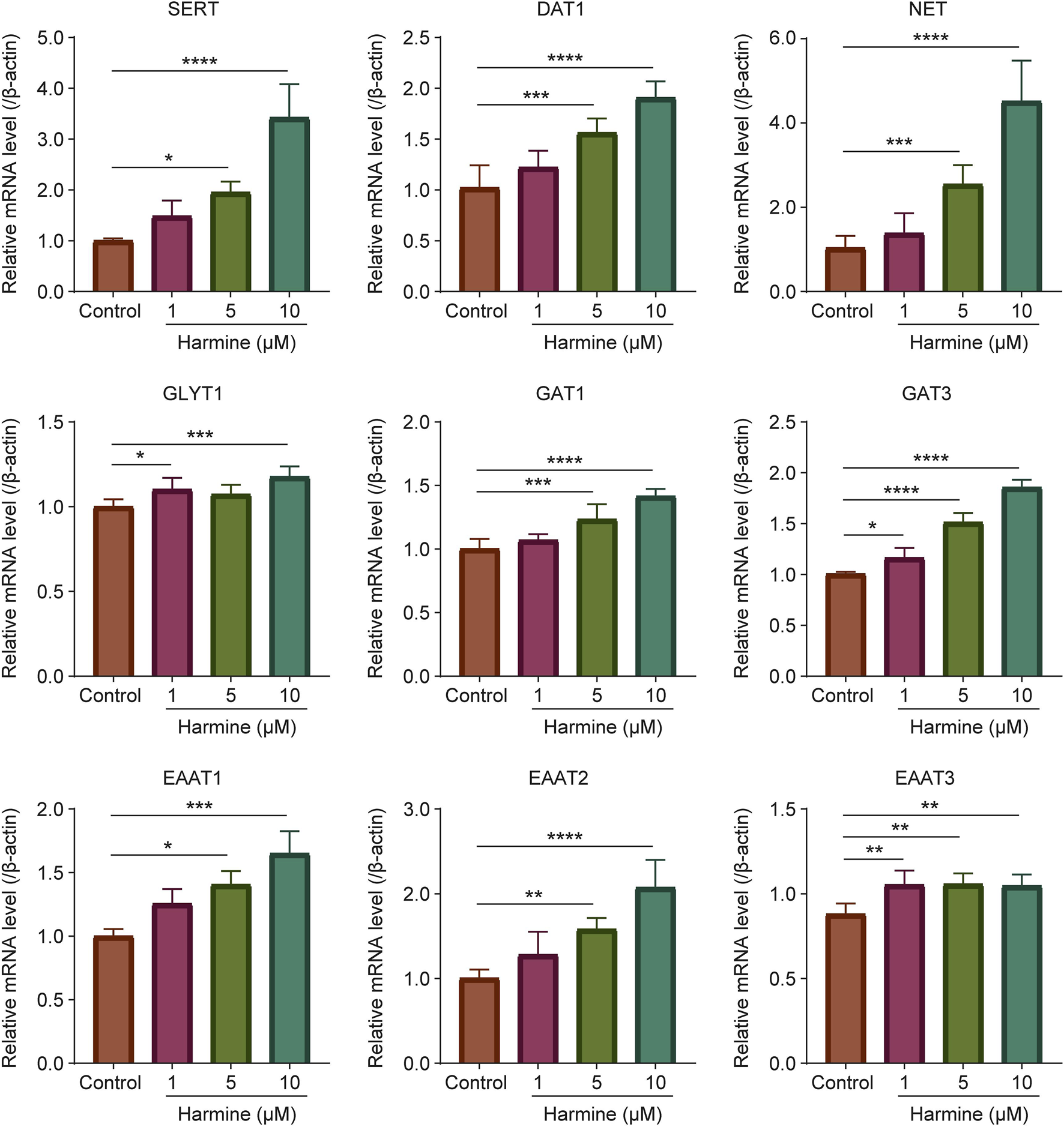 In the synaptosome release experiment, harmine was fixed at a final concentration of 10 μM and incubated with brain synaptosomes at 37°C for 20 min. The samples were then centrifuged at 15,000 × g for 15 min at 4°C. After centrifugation, the supernatant was removed and the synaptosomes were washed twice with uptake buffer. Subsequently, 100 μL high K+ release buffer was added, and samples were collected at 0, 10, 20, 40, and 60 min to measure the release amount. Sample processing and detection methods were carried out as described previously.