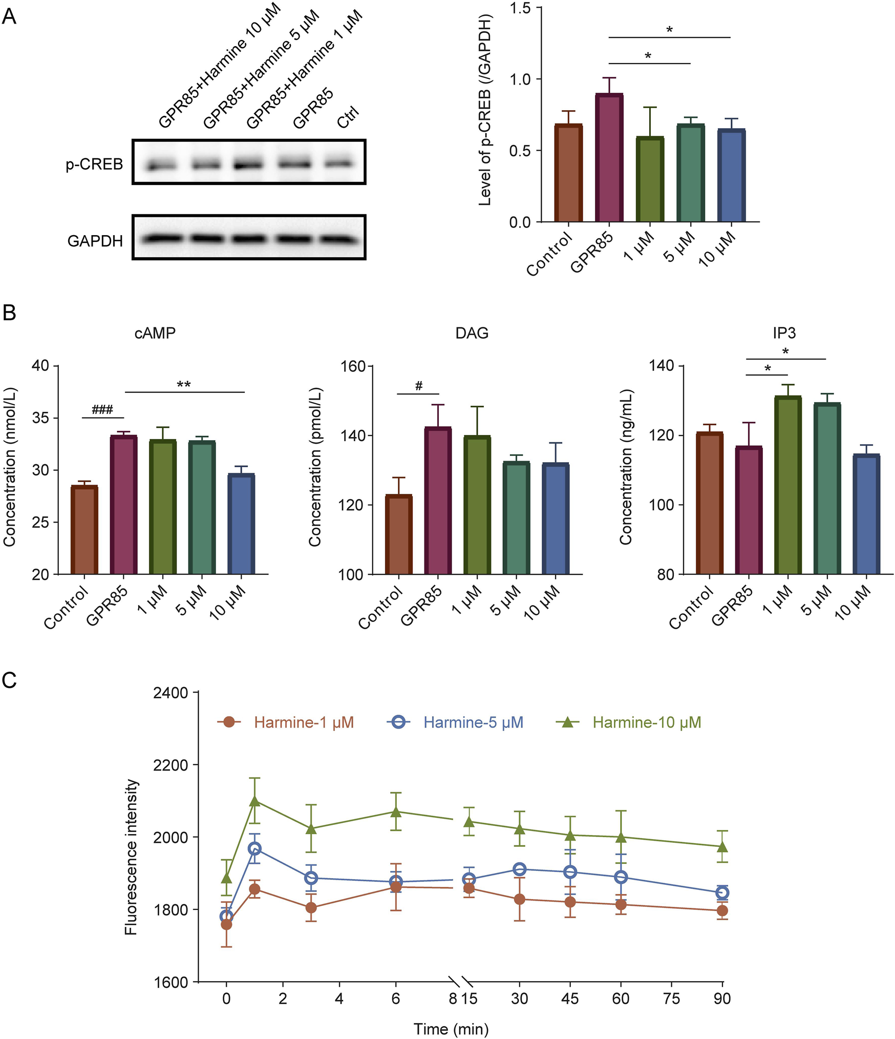 Figure 7. Validation of the interaction between harmine and its candidate receptors. (A) Western blotting analysis and quantification of p-CREB in GPR85-overexpressing cells following harmine treatment. (B) Measurement of second messenger levels (cAMP, DAG and IP3) in GPR85-overexpressing cells after harmine stimulation. (C) DiSBAC2(3) fluorescence intensity alterations in CLIC2-overexpressing cells after harmine stimulation. Data were presented as mean ± SD, n = 3/group. #p < 0.05, ###p < 0.001 compared with control group; *p < 0.05, **p < 0.01 compared with GPR85 group.