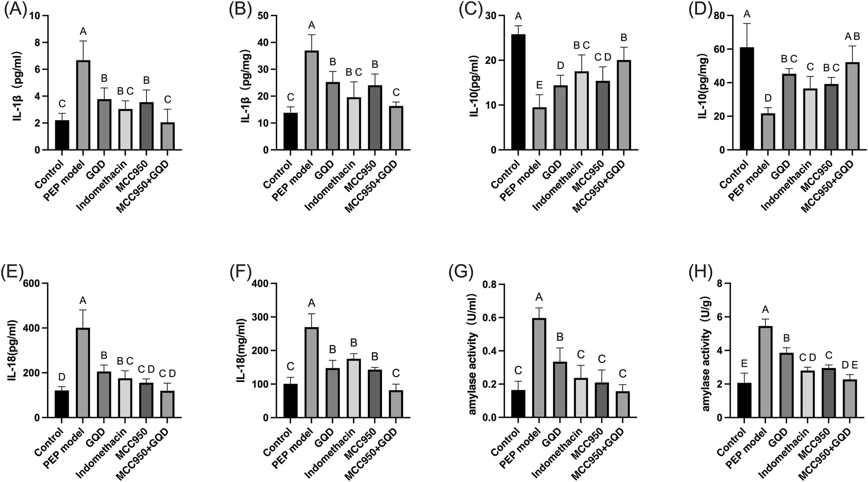 After sample collection, the levels of amylase in serum and pancreatic tissue were measured. In the PEP model group, both amylase and inflammatory cytokines were significantly elevated compared to the control group. In the GQD-treated group, levels of the inflammatory cytokines IL-1β and IL-18 were significantly reduced compared to the PEP model group (p < 0.05), while IL-10 levels were significantly increased (p < 0.05). There were no significant differences in inflammatory cytokines between the GQD-treated group and the PEP + Indomethacin group (p > 0.05), as shown in Figure 2.