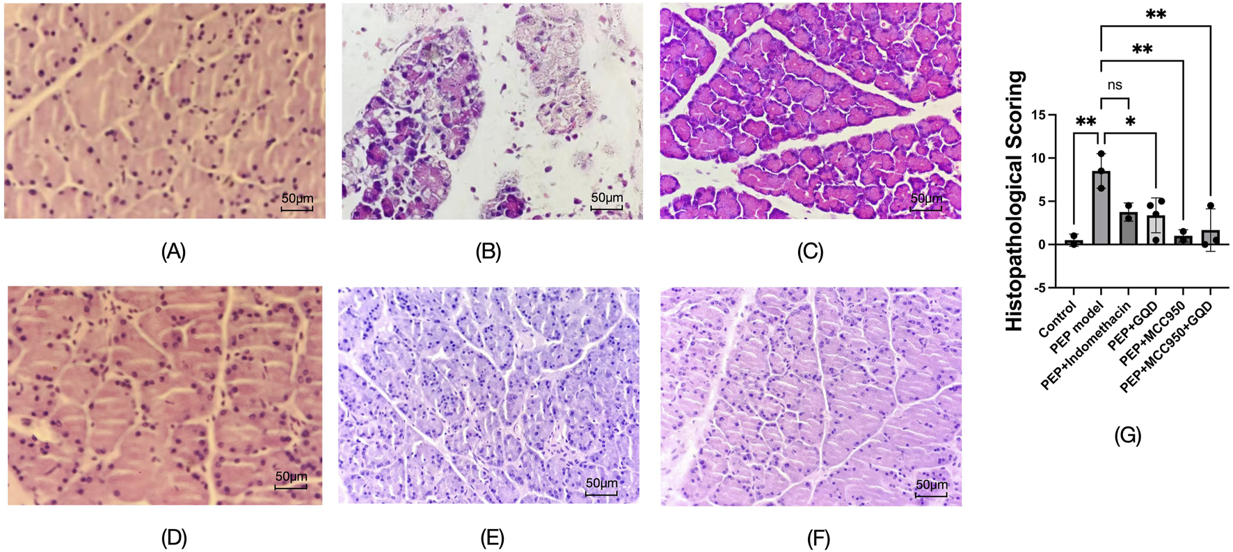Figure 3. Pathological manifestations of each group (HE; ×400). (A) Control; (B) PEP model; (C) PEP+Indomethacin; (D) PEP+GQD; (E) PEP+MCC950; (F) PEP+MCC950+GQD; (G) Histopathological score.
