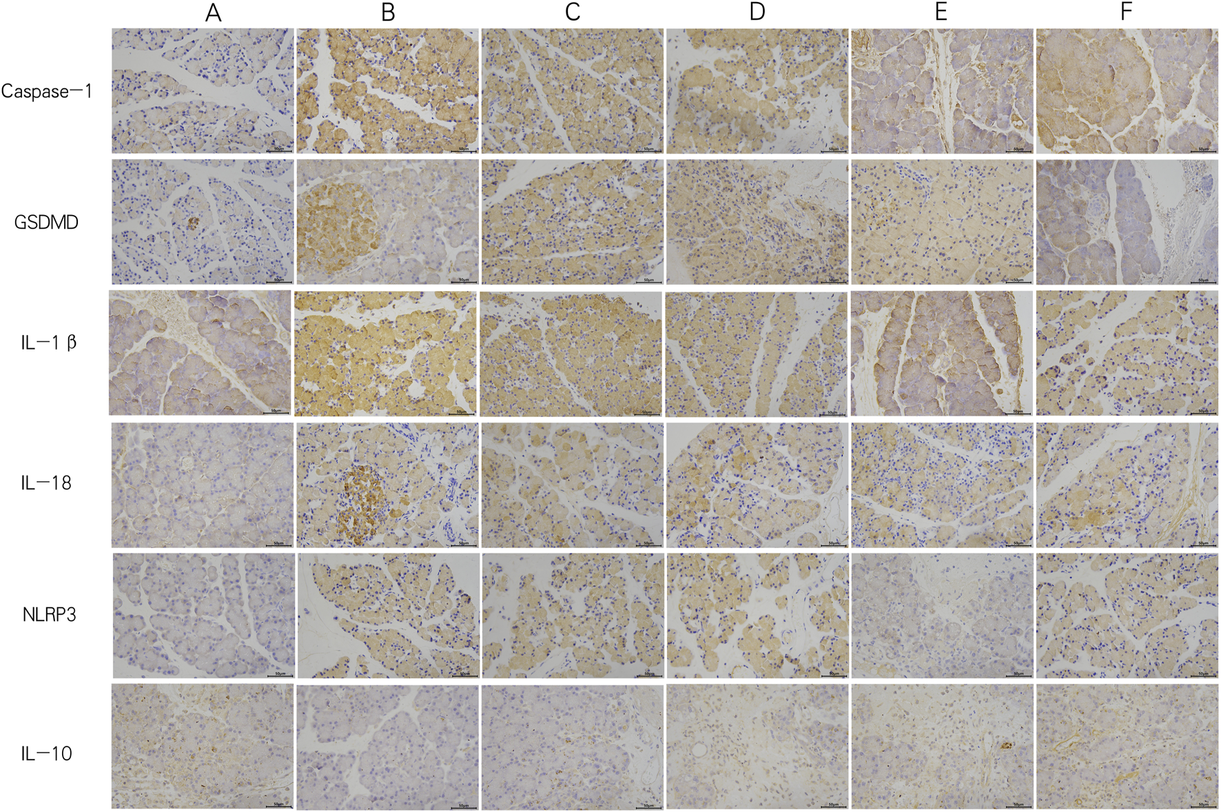 Figure 5. Immunohistochemistry of each group (×400). (A) Control; (B) PEP model; (C) PEP+Indomethacin; (D) PEP+GQD; (E) PEP+MCC950; (F) PEP+MCC950+GQD.