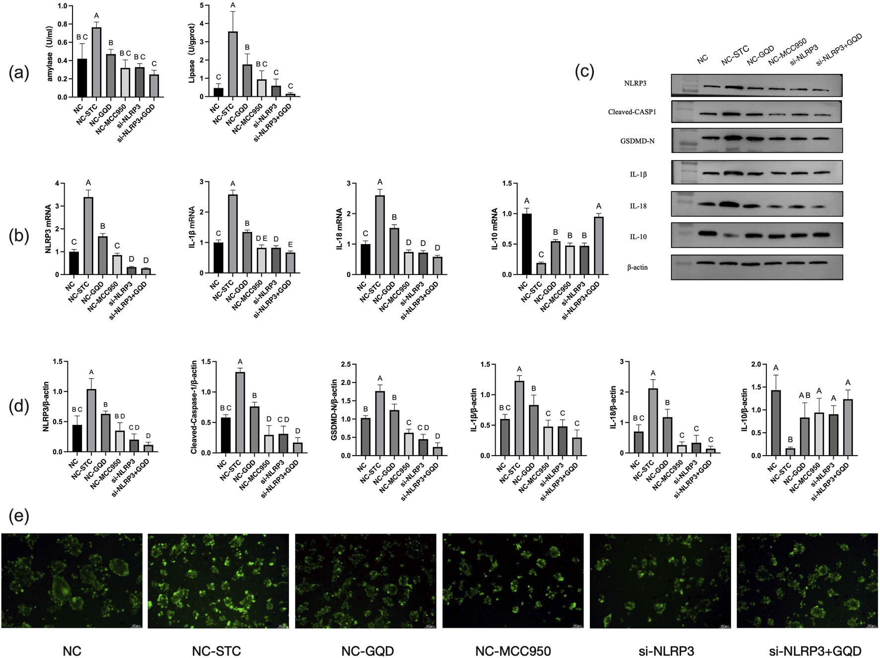 The results of GQD group, negative control (NC) group, STC model group and mcc950 positive control group were similar to those of in vivo experiments. In the cell experiment, siRNA group and siRNA+GQD group were added to verify the role of genes. The results showed that both groups significantly improved acinar cell inflammation compared with the model group (Figure 6).