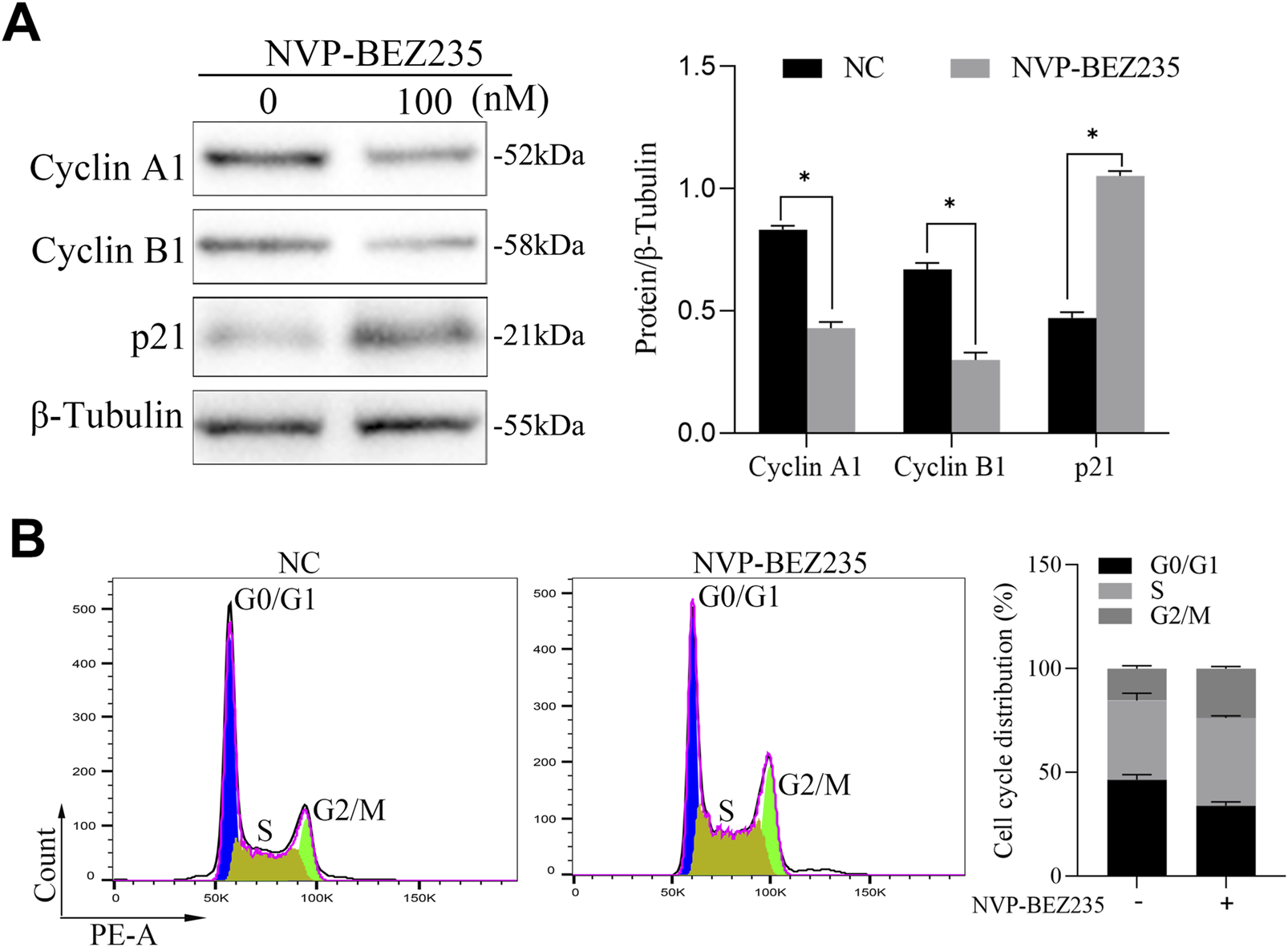 Figure 2. NVP-BEZ235 induced cell cycle arrest. (A) G401 cells were treated with NVP-BEZ235 (100 nM), and the levels of Cyclin A1, Cyclin B1, and p21 were quantified by western blot analyses. The blot shown is representative of three independent biological replicates with technical duplicates. (B) The cell cycle phase after NVP-BEZ235 treatment was determined by flow cytometric analysis. Data are presented as mean ± SD of three independent experiments; *P < 0.05, NC: Negative Control.