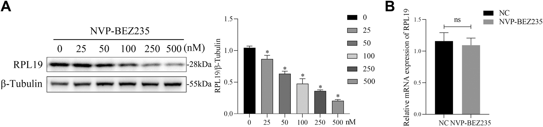 Figure 3. NVP-BEZ235 downregulated the expression of RPL19 at a protein level. (A) G401 cells were treated with NVP-BEZ235 (0, 25, 50, 100, 250, and 500 nM) and western blot was used to RPL19 expression detection. The blot shown is representative of three independent biological replicates with technical duplicates. (B) The mRNA levels of RPL19 after NVP-BEZ235 treatment were determined by qRT-PCR. Data are presented as mean ± SD of three independent experiments; *P < 0.05, ns: not significant, NC: Negative Control.