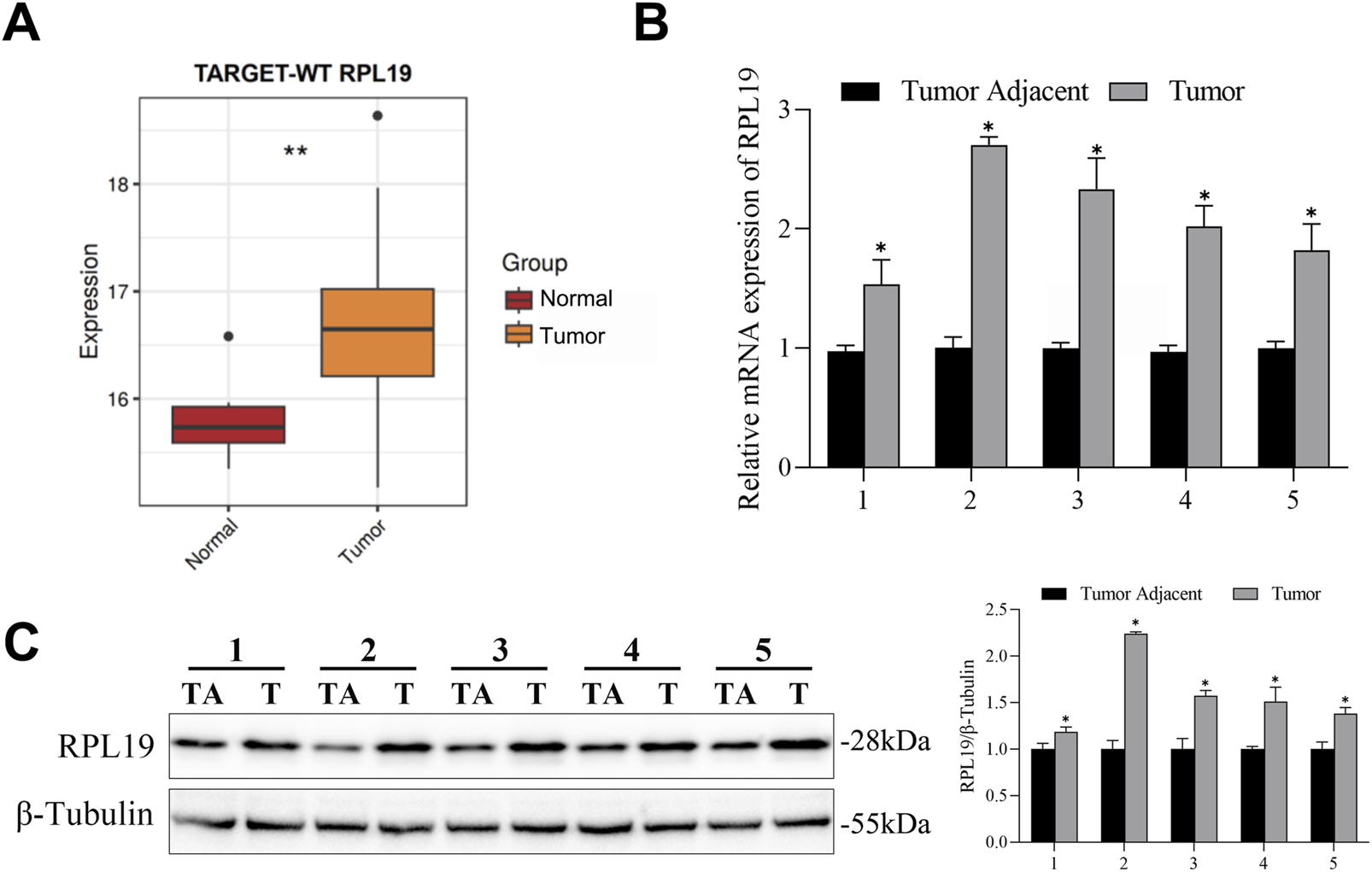 Figure 4. RPL19 was overexpressed in nephroblastoma. (A) The RPL19 mRNA expression dataset in nephroblastoma tissues and normal tissues was analyzed by R Studio. (B) RPL19 expression in 5 paired nephroblastoma tissues and corresponding adjacent samples was analyzed by qRT-PCR. (C) RPL19 expression in nephroblastoma tissues and corresponding adjacent samples was analyzed by western blot. The blot shown is representative of three independent biological replicates with technical duplicates. Data are presented as mean ± SD of three independent experiments; *P < 0.05, TA: Tumor Adjacant, T: Tumor.