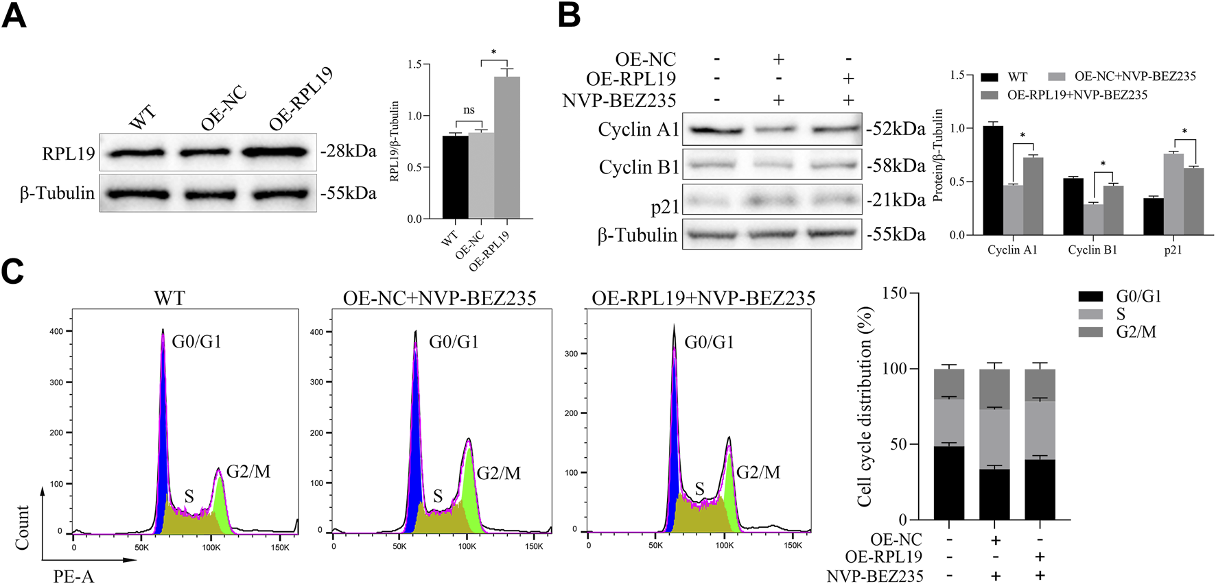 Figure 5. RPL19 reversed the effect of NVP-BEZ235 on cell cycle. (A) The transfection efficiency of OE-RPL19 in G401 cells was detected by Western blotting. (B) The levels of Cyclin A1, Cyclin B1, and p21 in G401 cells transfected with OE-RPL19 under the treatment of NVP-BEZ235 were detected by western blot. (C) The cell cycle phase in G401 cells transfected with OE-RPL19 after NVP-BEZ235 treatment was determined by flow cytometric analysis. Data are presented as mean ± SD of three independent experiments; *P < 0.05, WT: Wild Type.