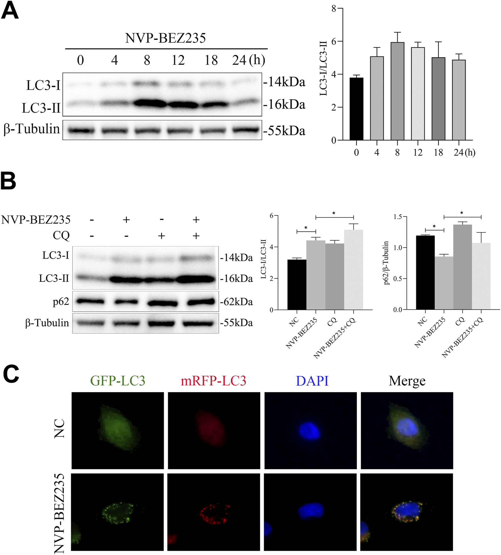 Figure 6. NVP-BEZ235 induced autophagy in G401 cells. (A) G401 cells were treated with 100 nM NVP-BEZ235 for 0, 4, 8, 12, 18, and 24 h, and western blot was used to LC3 expression detection. (B) G401 cells were treated with 100 nM NVP-BEZ235 and/or 5 µM CQ for 12 h, and the expressions of LC3 and p62 were quantified by western blot. (C) The autophagy flux was observed by transfection with mRFP-GFP-LC3 adenovirus. Data are presented as mean ± SD of three independent experiments; *P < 0.05, NC: Negative Control.