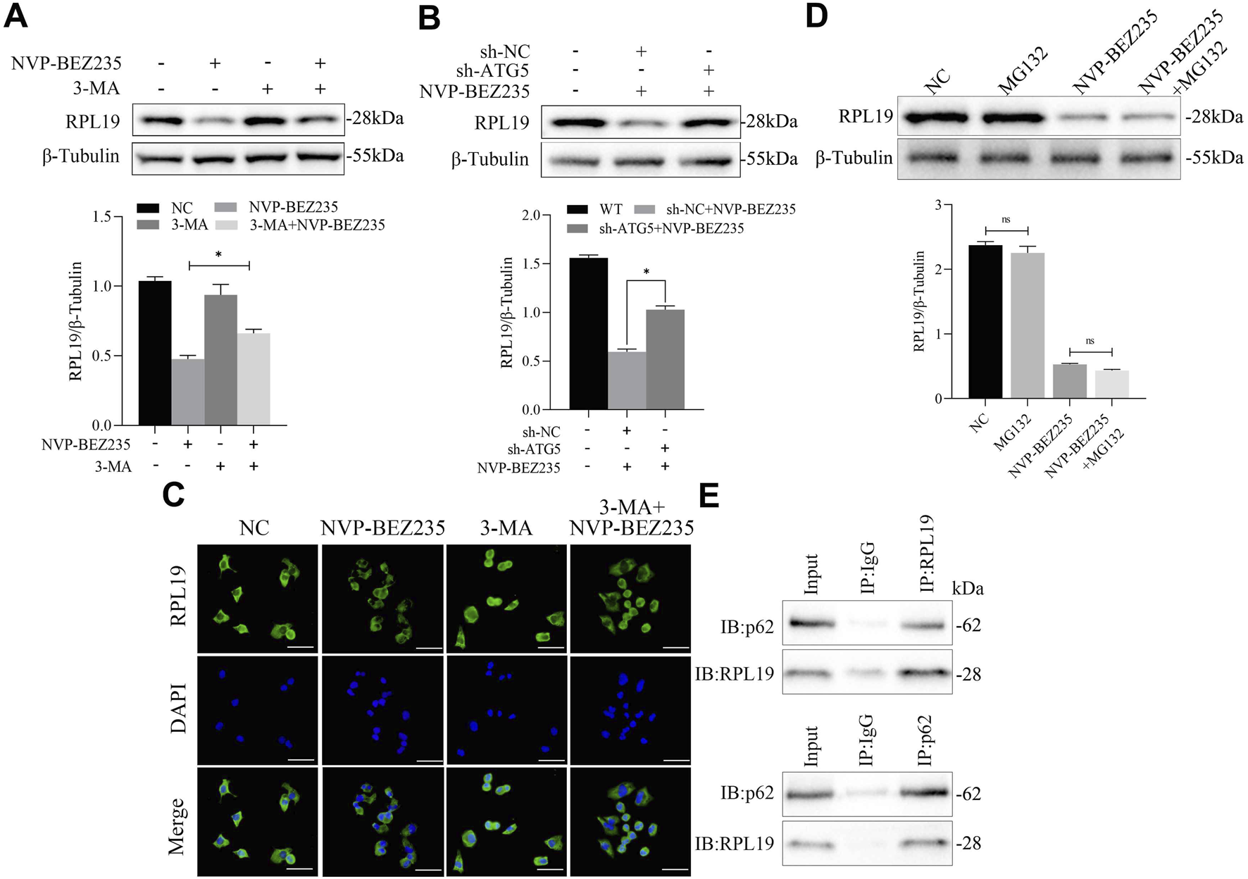 Figure 7. Inhibition of autophagy attenuated the inhibitory effect of NVP-BEZ235 on RPL19 expression. (A) G401 cells were treated with NVP-BEZ235 and/or 3-MA, and western blot was used to RPL19 expression detection. (B) G401 cells transfected with sh-ATG5 or sh-NC were treated with NVP-BEZ235, and the expression of RPL19 was detected by western blot. (C) G401 cells were treated with NVP-BEZ235 and/or 3-MA, and immunofluorescence analysis was used to RPL19 expression detection. (D) G401 cells were treated with NVP-BEZ235 and/or MG132, and western blot was used to RPL19 expression detection. (E) The interaction of RPL19 and p62 under the treatment of NVP-BEZ235 was detected by co-immunoprecipitation experiment. Data are presented as mean ± SD of three independent experiments; *P < 0.05.