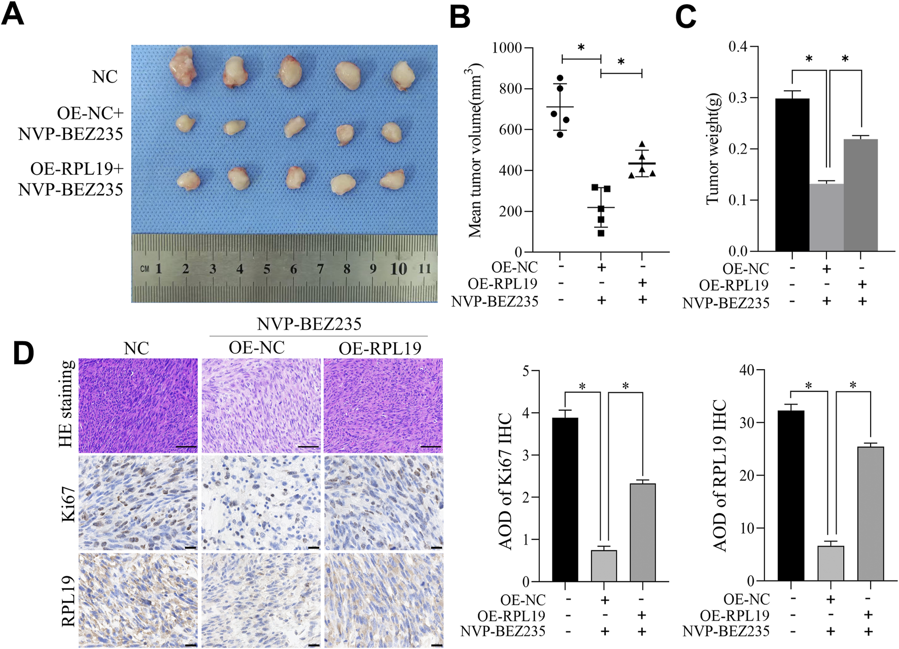 Results: NVP-BEZ235 inhibited the proliferation of G401 cells. It arrested the cell cycle in the G2/M phase and induced autophagy. RPL19 was overexpressed in nephroblastoma tissues, and NVPBEZ235 suppressed the expression of RPL19 protein. Furthermore, the treatment with NVP-BEZ235 induced autophagy, leading to the downregulation of RPL19 expression in G401 cells. In the in vivo study, NVPBEZ235 significantly inhibited tumor growth in the drug treatment group, while RPL19 overexpression partially counteracted the drug’s effects, promoting tumor growth.