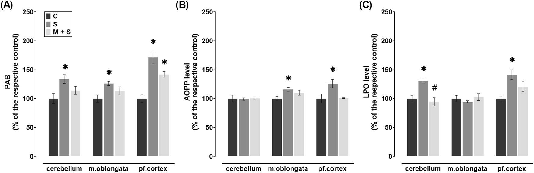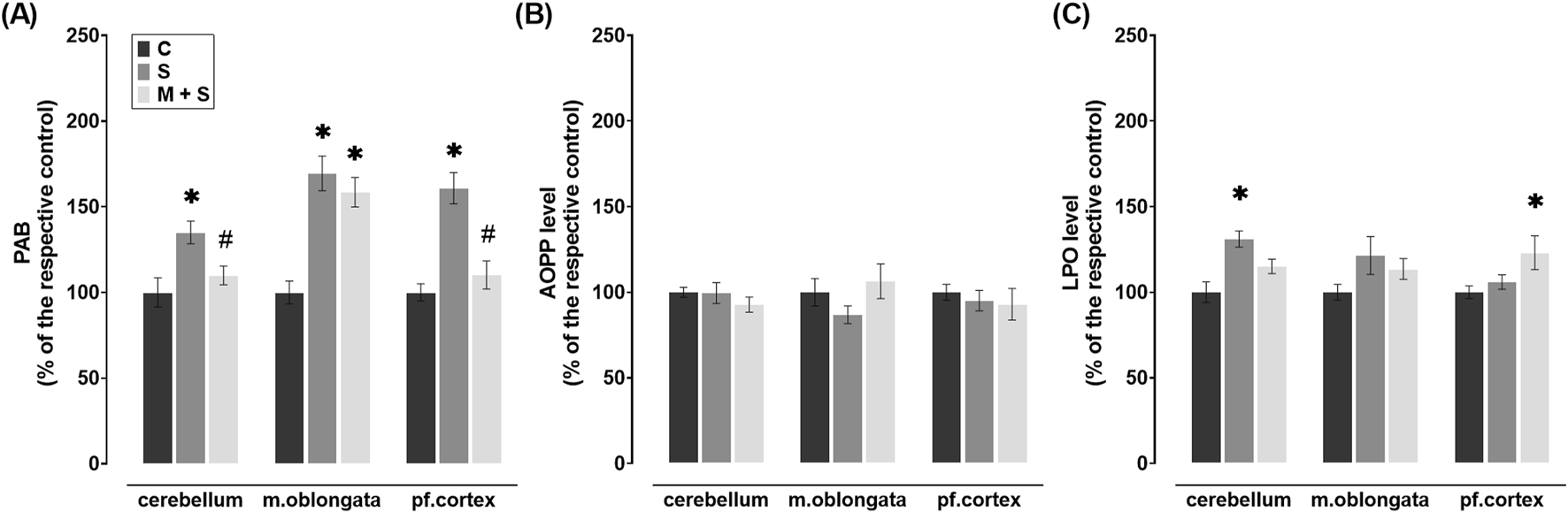 PAB levels were significantly elevated in all three brain regions of rats in the S group (cerebellum: Z = 2.92; P = 0.0103; medulla oblongata: Z = 2.85; P = 0.013; prefrontal cortex: DF = 20, P < 0.0001) in comparison to the C group (Figure 2A). However, in the cerebellum and medulla oblongata of M + S group they were similar to the control values, while in the prefrontal cortex, they were increased (DF = 20, P = 0.0259) compared to the C group (Figure 2A).