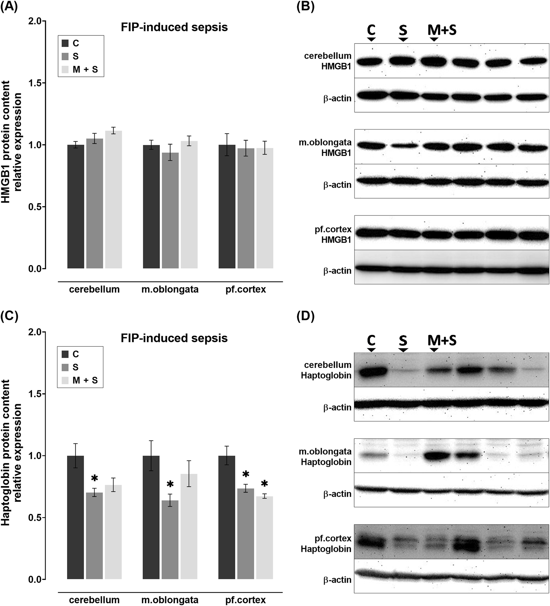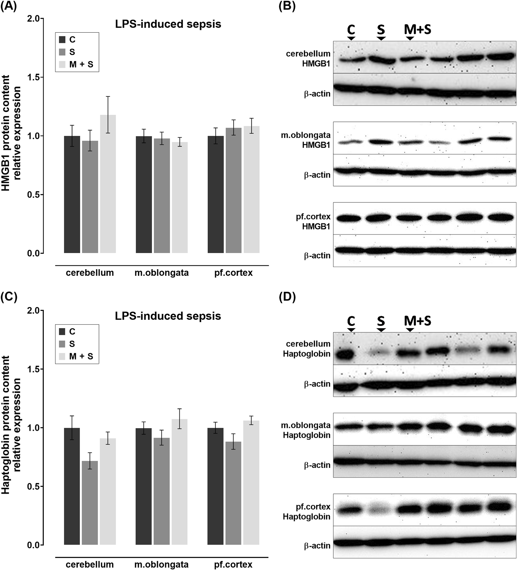 Effect of meldonium pretreatment on HMGB1 and haptoglobin content in cerebellum, medulla oblongata, and prefrontal cortex of rats with LPS-induced sepsis. Following LPS-induced sepsis, no changes in (A,B) HMGB1 or (C,D) haptoglobin protein content were observed in any of the investigated brain regions, with or without meldonium, as revealed by Western blot analysis. All values are presented as mean ± SEM. * and # indicate P < 0.05 (* vs. sham control; # vs. sepsis), as determined by one-way ANOVA with Tukey’s or Kruskal–Wallis with Dunn’s post hoc test, depending on data distribution. β-actin was used as a loading control. Abbreviations: LPS, lipopolysaccharide; HMGB1, high mobility group box 1; m. oblongata, medulla oblongata; pf., prefrontal; C, sham control; S, sepsis; M + S, meldonium + sepsis.