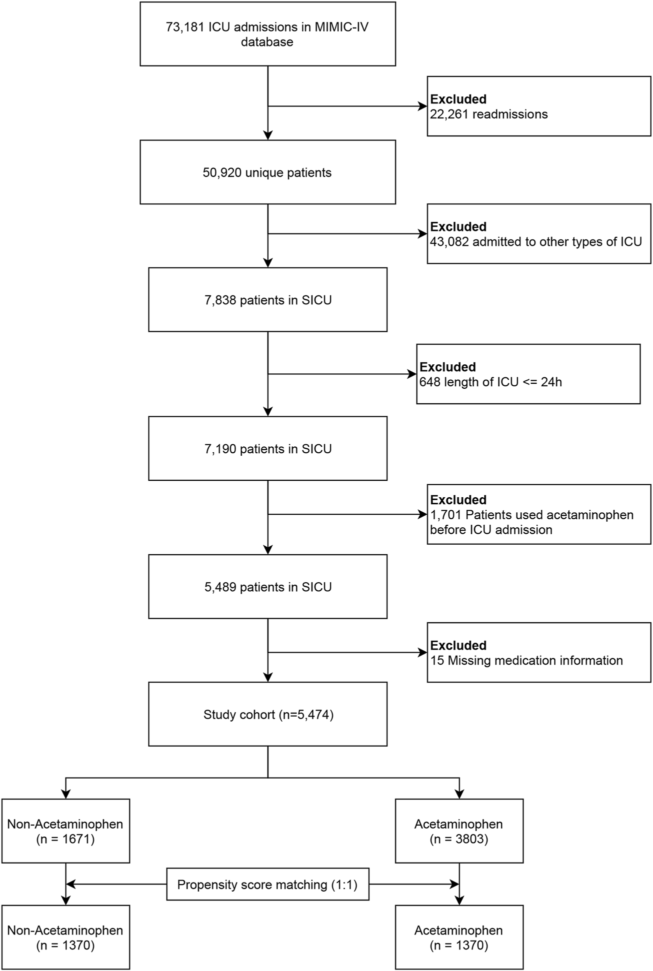 This study included adult critically ill patients admitted to the SICU. We excluded patients under 18, those with ICU stays under 24 h, those who had taken acetaminophen before ICU admission, and those with incomplete records of acetaminophen administration times or routes. For patients with multiple ICU admissions, only the first admission was considered. Figure 1 shows the patient selection process.