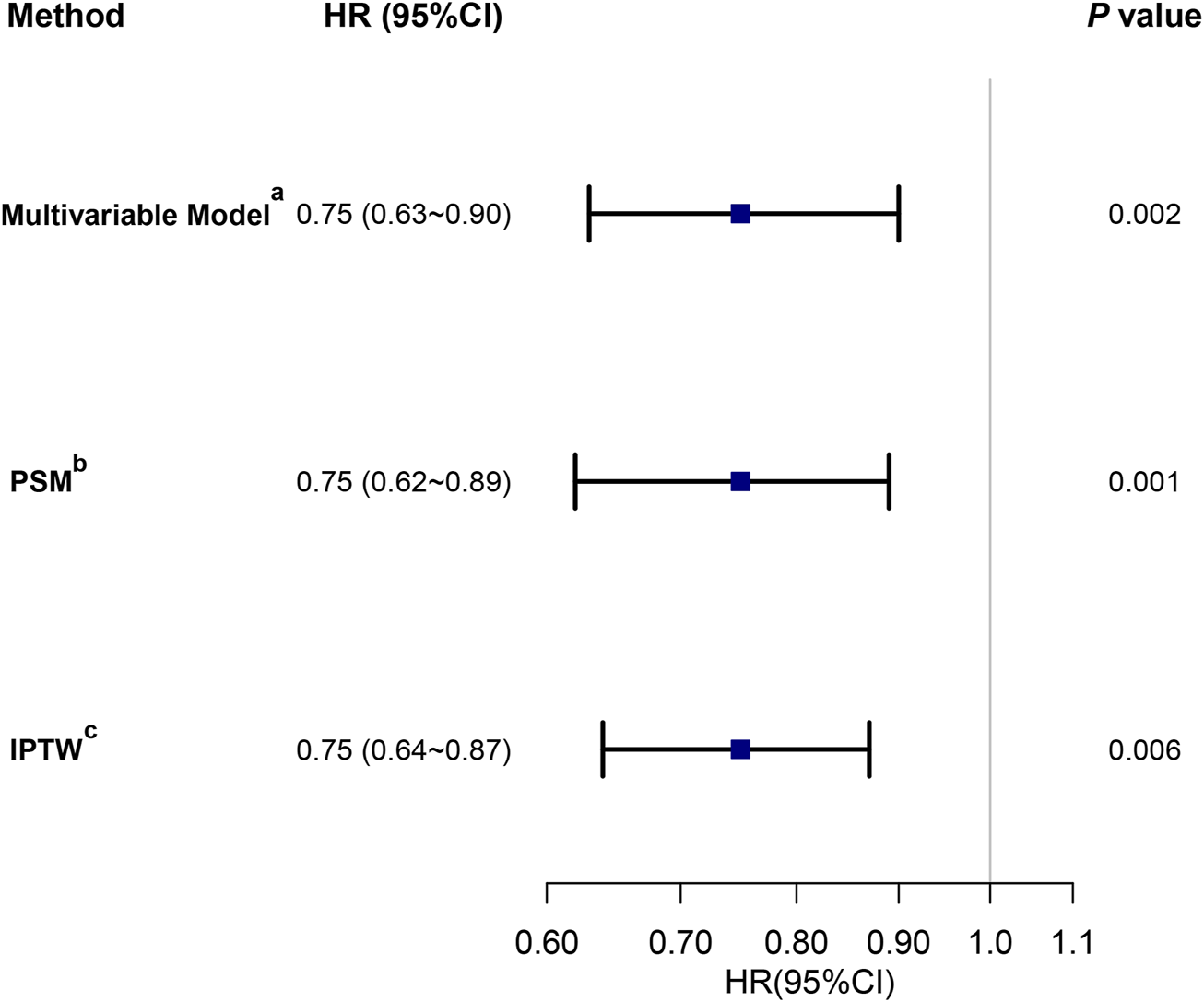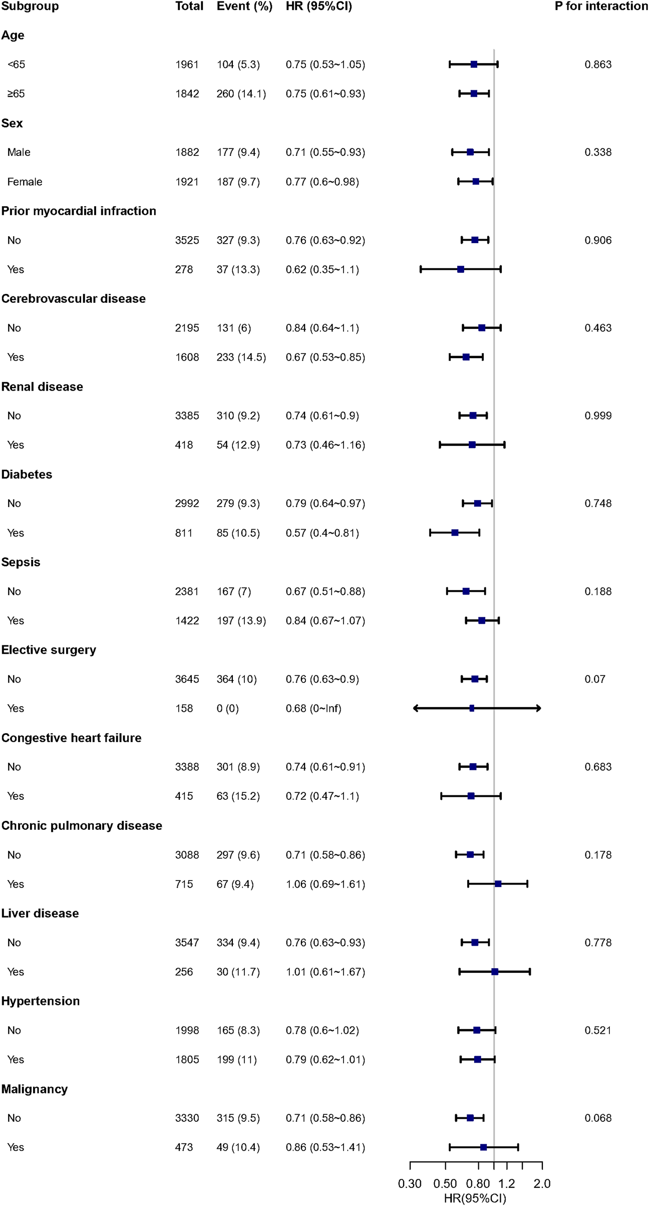 The multivariable Cox regression revealed a reduced in-hospital mortality with acetaminophen use (Figure 2), exhibiting an adjusted HR of 0.75 (95% CI, 0.63–0.90, P = 0.002). Details of the regression are in Supplementary Table S2. Utilizing PSM and IPTW minimized covariate imbalances between the ACE and non-ACE groups, maintaining a consistent association (Figure 2). Subgroup analyses, considering factors such as age, sex, and histories of myocardial infarction, cerebrovascular disease, renal disease, diabetes, sepsis, elective surgery, congestive heart failure, chronic pulmonary disease, liver disease, hypertension, and malignancy, further supported this consistency across subgroups (Figure 3).