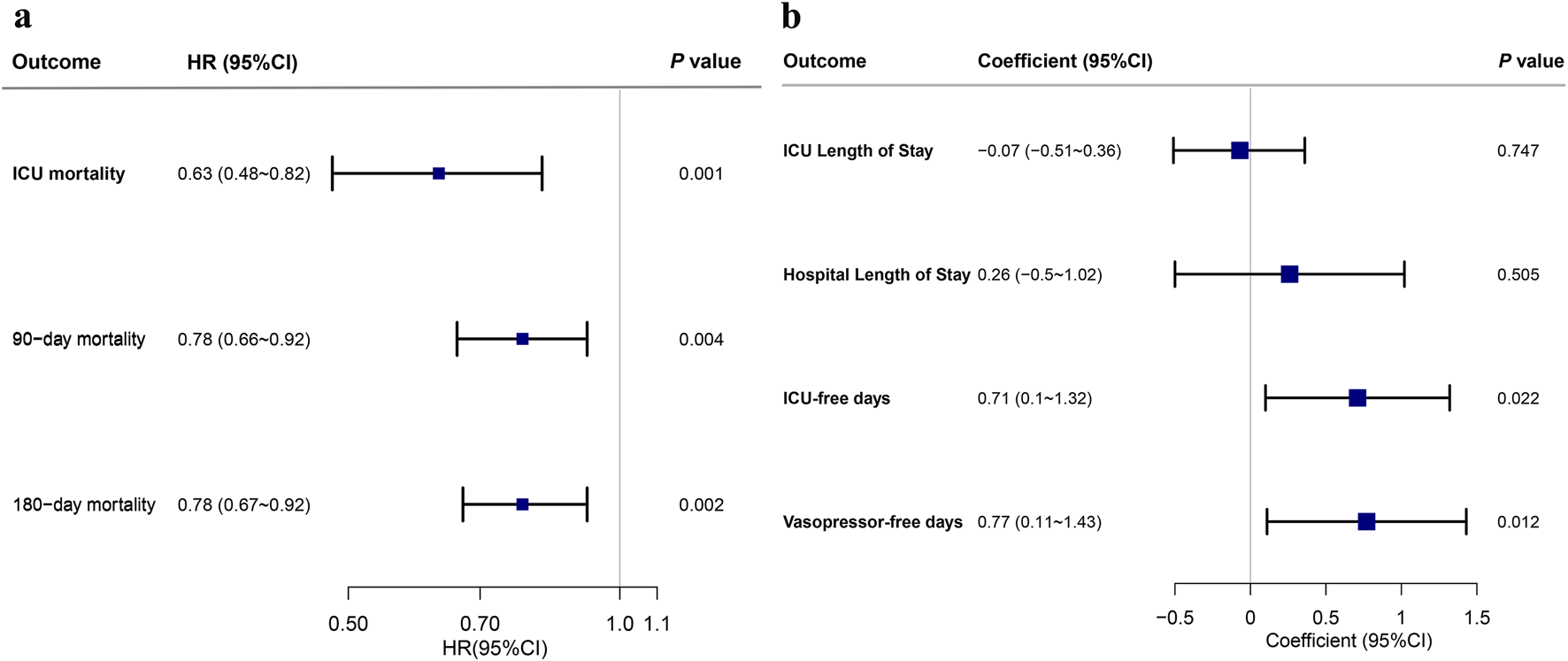The relationship between acetaminophen exposure and secondary outcomes was examined using matched cohorts. Multivariable Cox regression assessed the association with mortality (ICU, 90-day, and 180-day). Multivariable linear models were used to estimate adjusted coefficients and 95% CIs for the durations of ICU and hospital stay, ICU - free days to day 28, and vasopressor - free days to day 28.