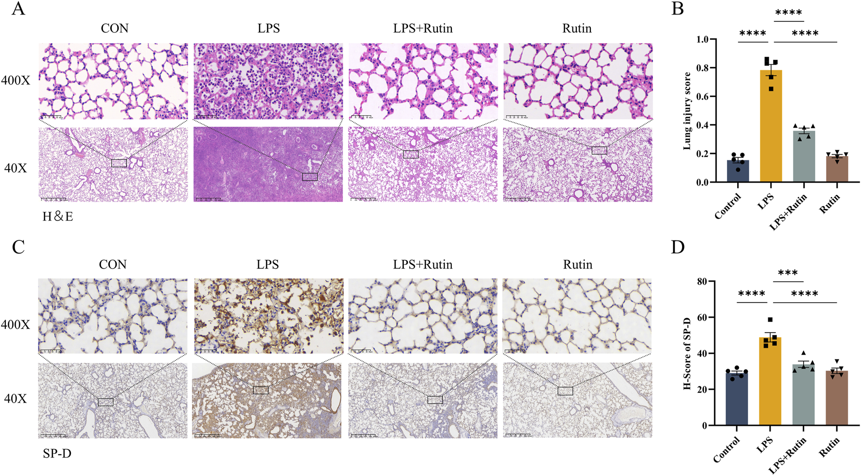 Figure 2. Rutin alleviates LPS-induced lung tissue damage. (A) Hematoxylin and eosin (HE) staining of lung tissues. (B) Quantification of the lung injury score in each group. (C) Immunohistochemistry staining for SP-D and quantification of the protein expression (D). *p < 0.05, **p < 0.01, ***p < 0.001, ****p < 0.0001.