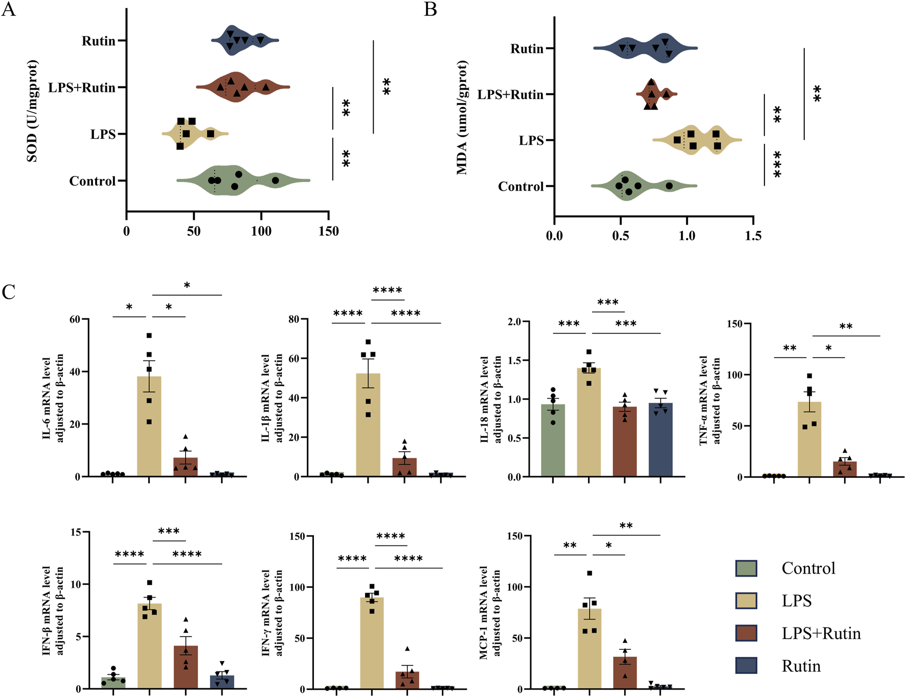 Figure 3. Rutin reduces oxidative stress and cytokine storm in the lung tissue of the ALI mouse model. The content of SOD (A) and MDA (B) in each group of lung tissue. (C) RT-qPCR analysis was conducted to measure the expression levels of various cytokines, including TNF-α, IL-1β, IL-6, IL-18, IFN-γ, IFN-β, and MCP-1 in the lungs. *p < 0.05, **p < 0.01, ***p < 0.001, ****p < 0.0001.