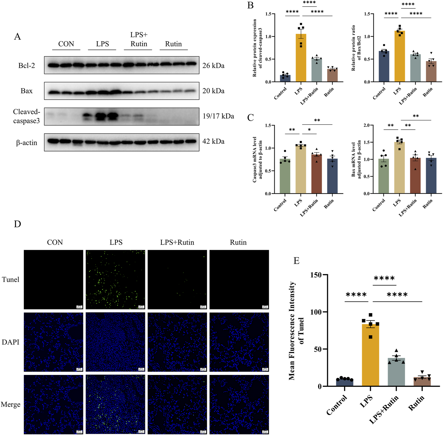 Figure 4. Rutin mitigates apoptosis in mice. (A) The expression level of bax, bcl2, and cleaved-caspase3 was detected by Western blot. (B) Quantification of the protein level of cleaved-caspase3 and the ratio of Bax/Bcl2 in each group. (C) The mRNA level of Bax and Casp3 in lungs. (D) TUNEL staining of apoptotic cells in each group. (E) The mean fluorescence intensity of apoptotic cells in each section. *p < 0.05, **p < 0.01, ***p < 0.001, ****p < 0.0001.