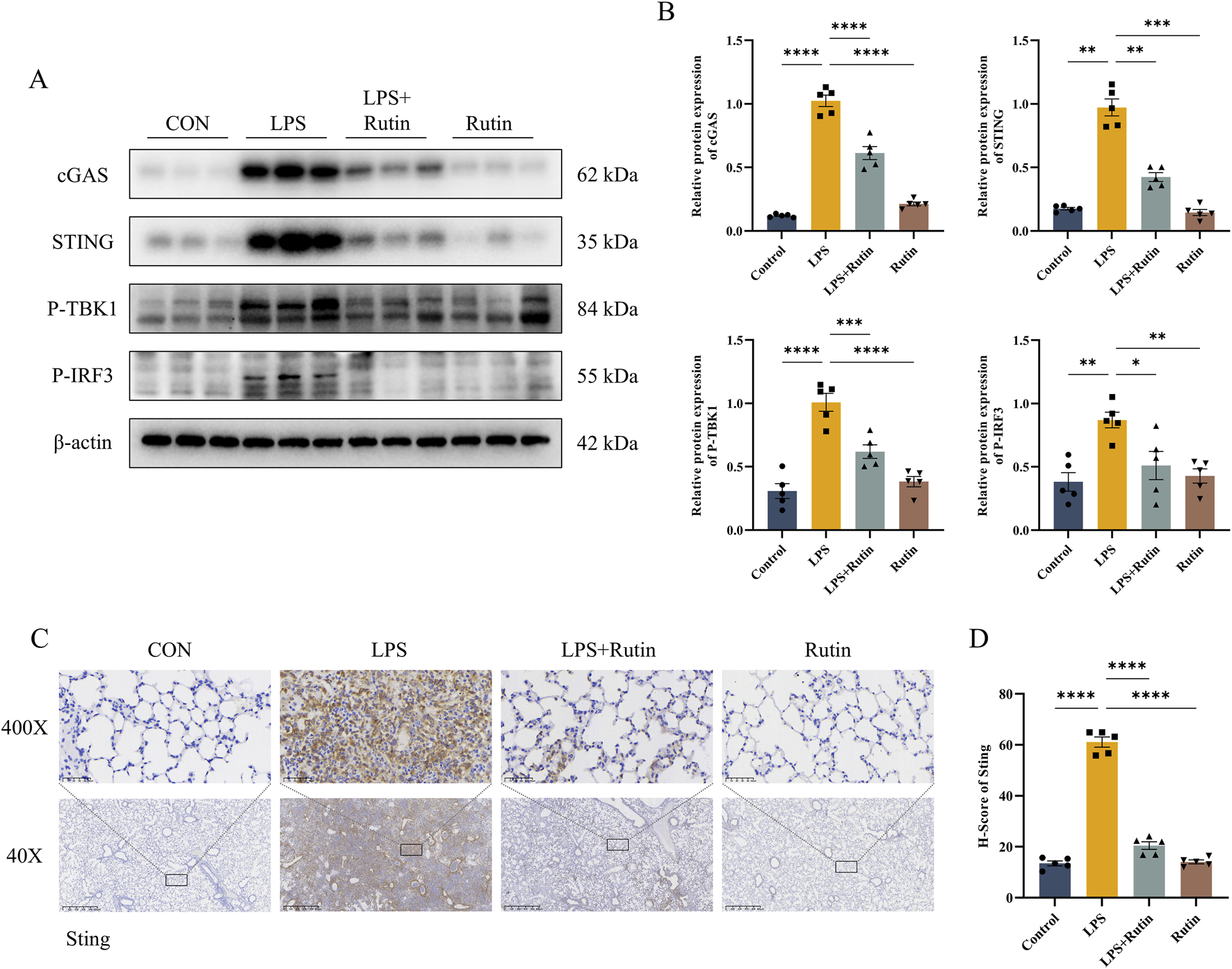 Figure 5. Rutin suppresses the activation of the cGAS-STING pathway induced by LPS in the ALI animal model. (A) The expression level of cGAS, STING, P-TBK1, and P-IRF3 detected by Western blot and their Protein level quantification (B). (C) Immunohistochemistry staining is used for STING and quantification of protein expression (D). *p < 0.05, **p < 0.01, ***p < 0.001, ****p < 0.0001.