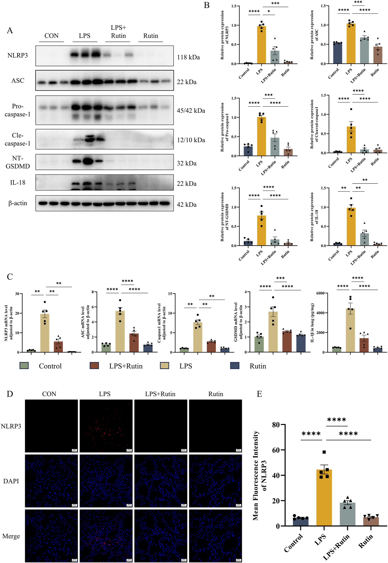 Figure 6. Rutin effectively suppresses NLRP3-mediated pyroptosis in vivo. (A) The expression level of NLRP3, ASC, Pro-casp1, Cle-casp1, NT-GSDMD, and IL-18 was detected by Western blot and their protein level quantification (B). (C) The mRNA level of NLRP3, ASC, Casp1, and GSDMD in lungs. (D) Immunofluorescence analysis of the expression of NLRP3 in each group. (E) Mean fluorescence intensity of the expression of NLRP3 in each section. *p < 0.05, **p < 0.01, ***p < 0.001, ****p < 0.0001.