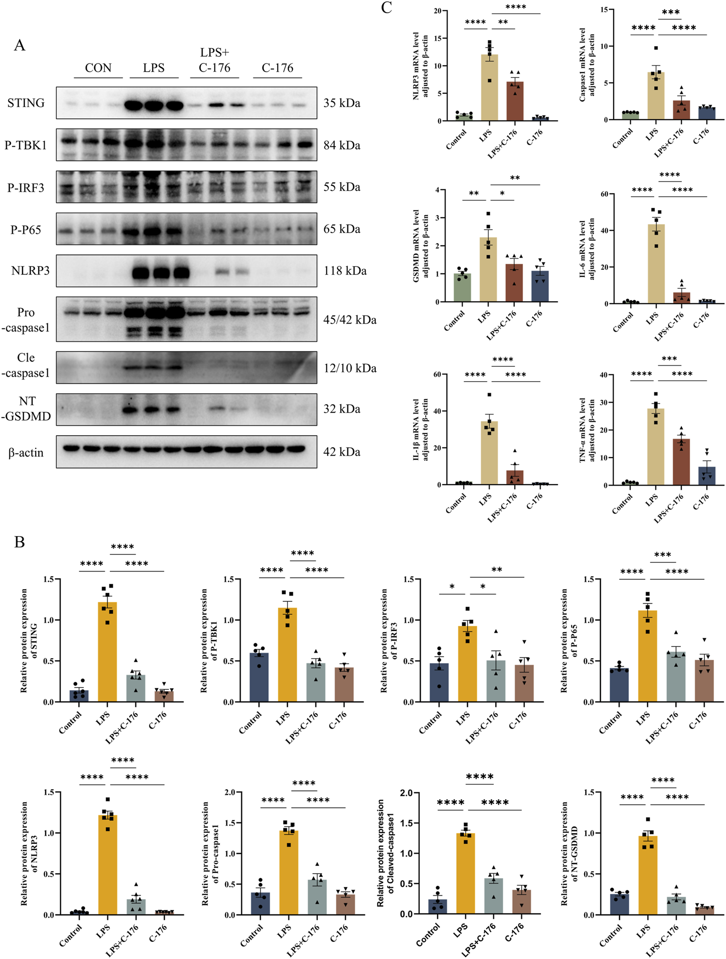 The NLRP3 inflammasome plays a crucial role in the pathogenesis and progression of ALI (Freeman and Swartz, 2020). Recent studies have highlighted the ability of STING to activate the NLRP3 inflammasome, thereby triggering pyroptosis (Li et al., 2019). To explore the specific impact of STING on pulmonary pyroptosis in ALI, we employed the STING inhibitor C-176 to suppress STING activation. Our results showed that inhibiting STING pharmacologically led to a significant downregulation of NLRP3, Caspase-1, and GSDMD at both the protein and RNA levels (Figures 7A–C). These findings suggest that the cGAS-STING-NLRP3 axis is a key regulator of cell pyroptosis in the LPS-induced ALI mouse model.