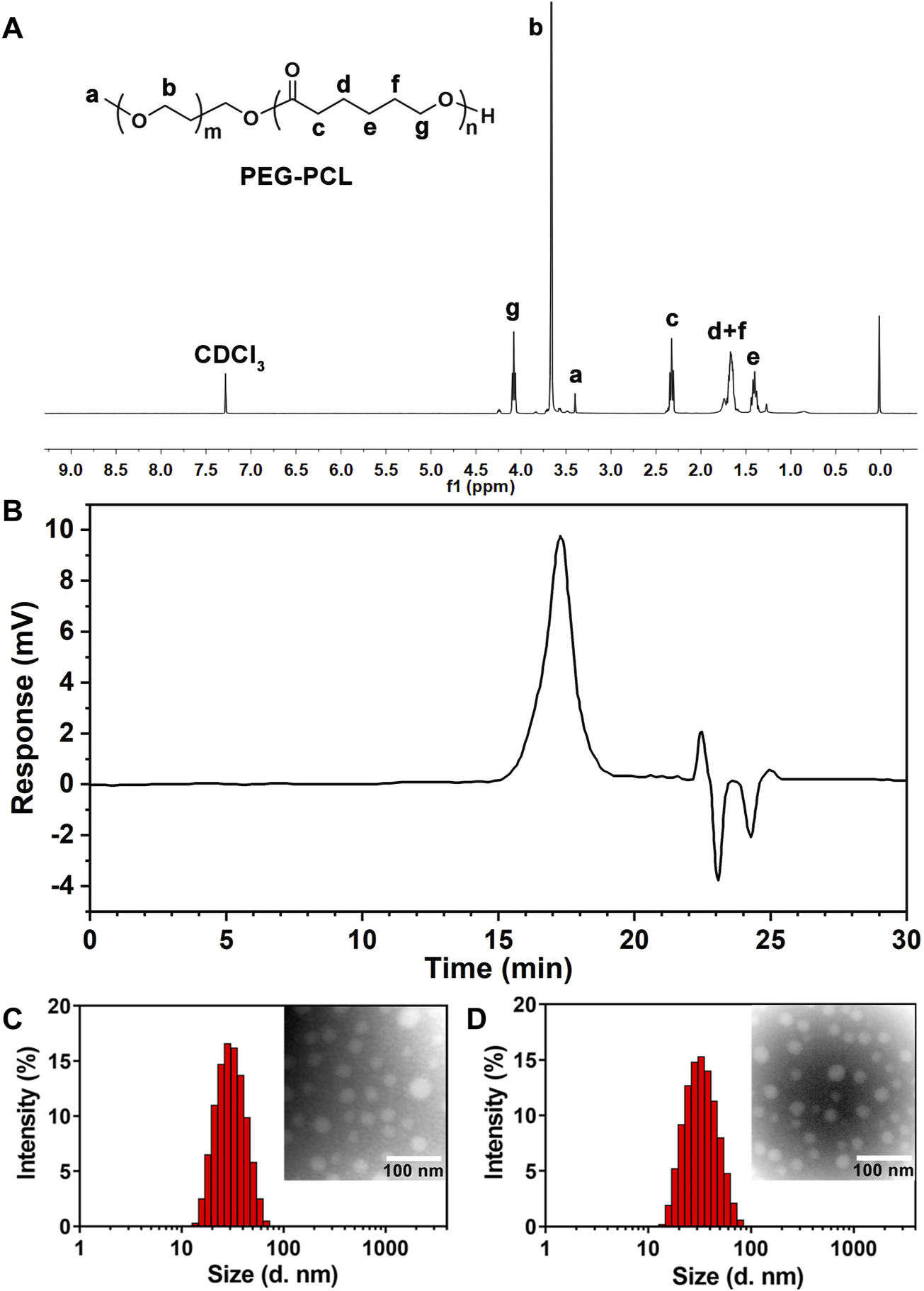 The chemical structure of PEG-PCL copolymer were characterized by 1HNMR in deuterated CDCl3 at 600 Hz (Bruker Avance Neo 600, Germany). The molecular weight and molecular weight distribution of PEG-PCL copolymer were measured by gel permeation chromatography (GPC) (LC-20ADXR, Shimadzu, Japan) equipped with a RID-20 A refractive index detector. The GPC analysis was conducted at 35°C, with tetrahydrofuran (THF) as the eluent and a flow rate of 1 mL/min. The calibration was performed using polystyrene standards.