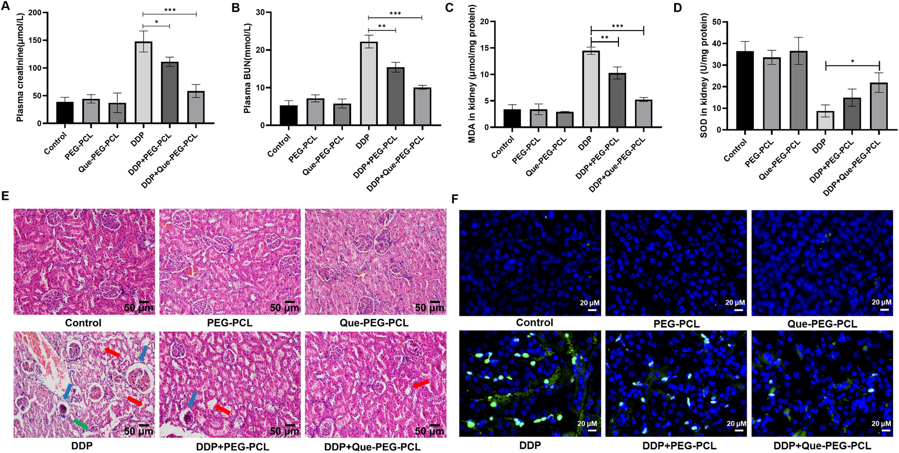 Que-PEG-PCL alleviated DDP-induced nephrotoxicity, oxidative stress, and apoptosis in rats. (A) Serum creatinine (Cr), (B) blood urea nitrogen (BUN), (C) malondialdehyde (MDA, oxidative stress marker), (D) superoxide dismutase (SOD, antioxidant enzyme activity). (E) Hematoxylin and eosin (H&E) staining of renal tissues (scale bar: 50 μm). (F) Terminal deoxynucleotidyl transferase dUTP nick end labeling (TUNEL) staining for apoptosis (green: TUNEL-positive cells). Statistical significance is indicated as *p < 0.05, **p < 0.01, ***p < 0.001 compared to the DDP group. Data are presented as mean ± S.D., with n = 3.