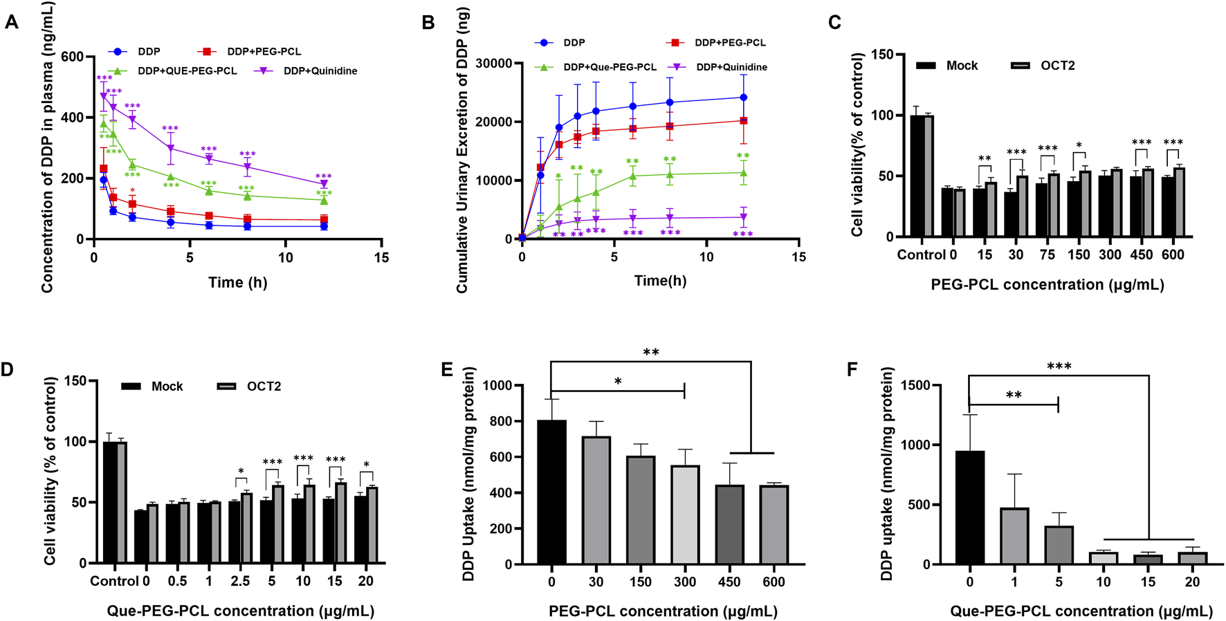 Effects of Que-PEG-PCL on the pharmacokinetics of DDP in rats and effects of OCT2 and DDP on the cytotoxicity and intracellular accumulation of PEG-PCL and Que-PEG-PCL in HEK293 cells and hOCT2-HEK293 cells. (A) Impact of PEG-PCL, Que-PEG-PCL, and Quinidine on the plasma concentration of DDP in rats. (B) Influence of PEG-PCL, Que-PEG-PCL, and Quinidine on the urinary excretion of DDP in rats. The cytotoxicity of PEG-PCL (15–600 μg/mL) (C) and Que-PEG-PCL (D) (0.5–20 μg/mL) in mock- and hOCT2-HEK293 cells. (E,F) Concentration-dependent inhibition curve of PEG-PCL and Que-PEG-PCL on DDP uptake in hOCT2-HEK293 cells. Statistical significance is denoted as *p < 0.05, **p < 0.01, ***p < 0.001 compared to the DDP group. #p < 0.05, #p < 0.01, #p < 0.001 vs. mock cells. Data are presented as mean ± standard deviation (S.D.), with n = 3.