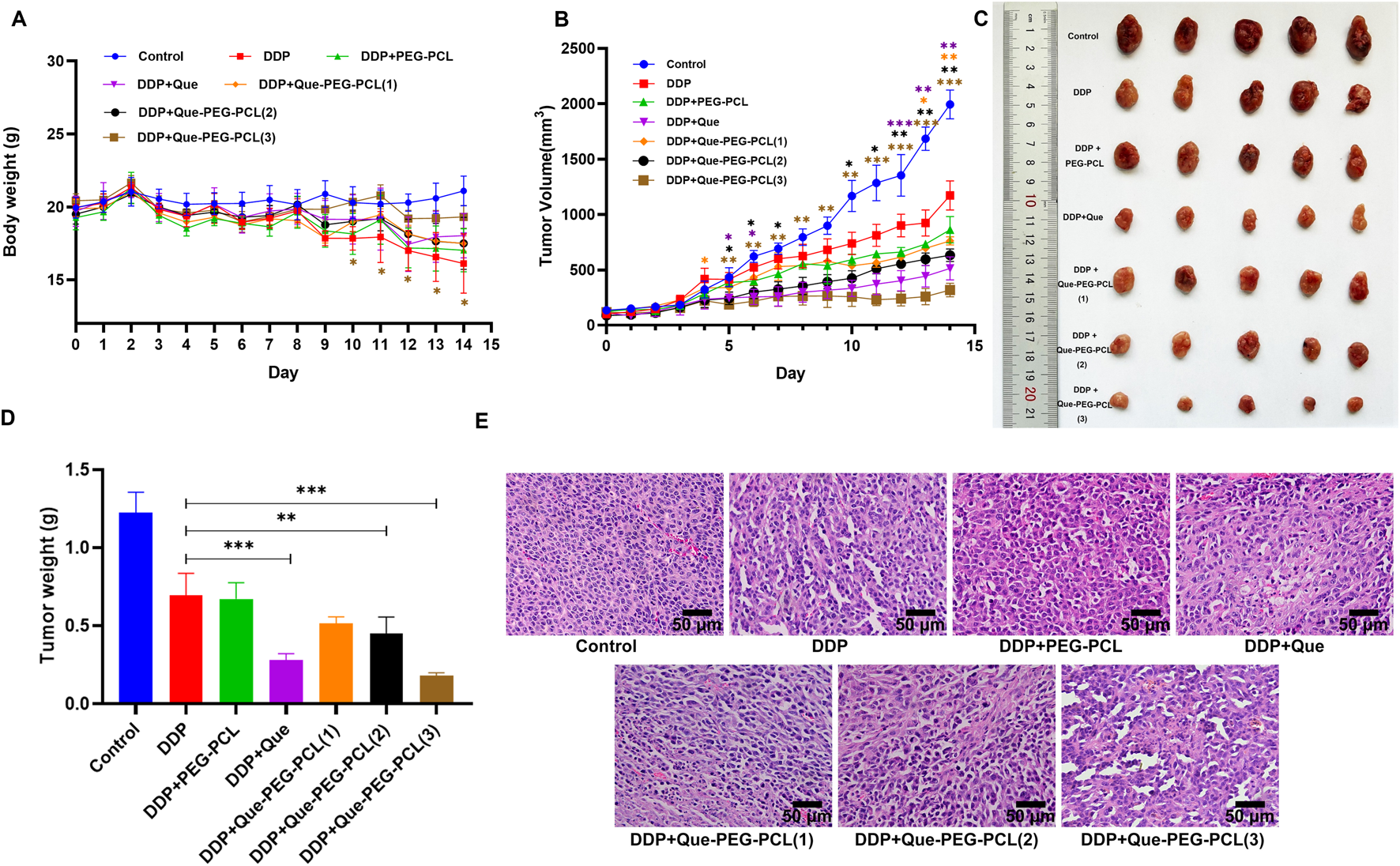 Influence of Que-PEG-PCL on the antitumor activity of DDP in mice with transplanted tumors. (A) Temporal changes in body weight of CT26 tumor-bearing mice following various therapeutic interventions. (B) Dynamics of tumor volume in CT26 tumor-bearing mice after different treatments. (C) Morphological alterations in tumors in CT26 tumor-bearing mice post-treatment. (D) Variations in tumor weight in CT26 tumor-bearing mice following diverse treatments. (E) Histopathological analysis of tumors in CT26 tumor-bearing mice treated with various formulations, as assessed by hematoxylin-eosin (HE) staining (scale bar: 50 μm). Statistical significance is indicated as *p < 0.05, **p < 0.01, ***p < 0.001 compared to the DDP group. Data are expressed as mean ± standard deviation (S.D.), with n = 3.