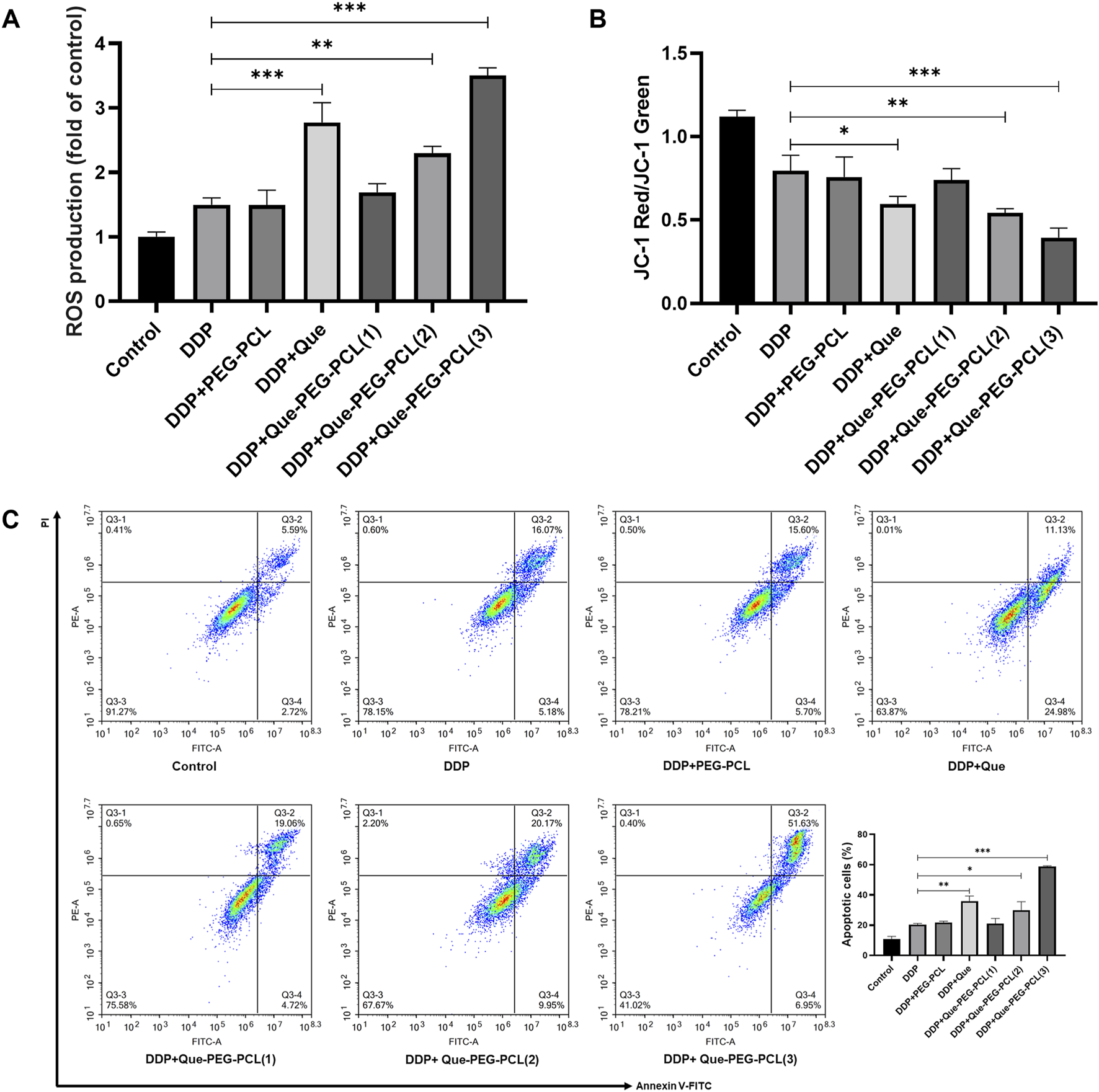Influence of Que-PEG-PCL on the antitumor activity of DDP in mice with transplanted tumors. (A) Reactive oxygen species (ROS) production measured by DCFH-DA fluorescence. (B) Mitochondrial membrane potential (ΔΨm) assessed by JC-1 staining (red/green fluorescence ratio). (C) Apoptosis rate quantified by flow cytometry (Annexin V/PI staining). Statistical significance is indicated as *p < 0.05, **p < 0.01, ***p < 0.001 compared to the DDP group. Data are expressed as mean ± standard deviation (S.D.), with n = 3.
