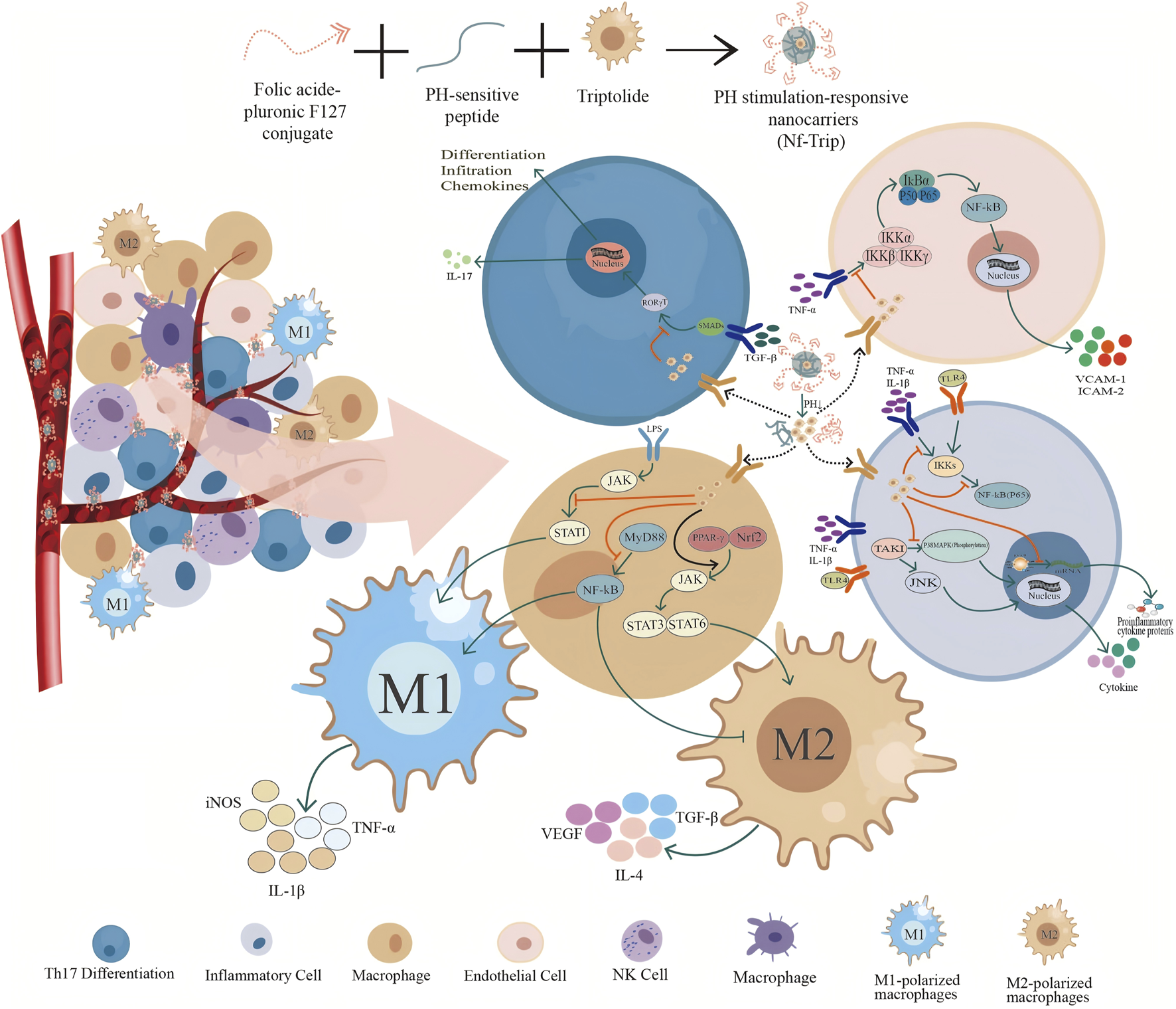 Figure 2. Intravascular release and mechanism of pH-responsive TwHF nanocarrier. Folate-conjugated F127, pH-sensitive peptides, and TwHF were co-assembled to construct a pH-responsive nanocarrier for the drug TwHF. In the in vivo environment, the TwHF nanoparticles are transported to inflammatory areas via blood vessels, where they disassemble due to the reduced pH at these sites. This process facilitates the release of TPL, allowing it to exert its anti-inflammatory and anti-tumor activities at the targeted locations. At inflammatory sites, TwHF exhibits various mechanisms of action on different cell types: it is absorbed by endothelial cells, inhibiting the release of adhesion factors VCAM-1 and ICAM-2 through the inhibition of the IKK signaling pathway, thereby reducing the adhesion of these factors to endothelial cells. In Th17 cells, it suppresses the transcription and translation of the pro-inflammatory factors IL-17 and the chemokine MMP-9 by inhibiting the SMADs and RORγT signaling pathways. In macrophages, TwHF promotes the differentiation of macrophages into M1 macrophages by inhibiting the JAK, STAT1, MyD88, and NF-kB signaling pathways. Concurrently, it enhances the activation of the JAK, STAT3, and STAT6 signaling pathways through the promotion of PPAR-γ signaling, further facilitating the differentiation of macrophages into M2 macrophages. In inflammatory cells, TwHF can inhibit the synthesis of pro-inflammatory cytokines and proteins by targeting IKKs, NF-kB (P65), and TAK1 signaling pathways, and by interfering with the translation program of RNA polymerase II.