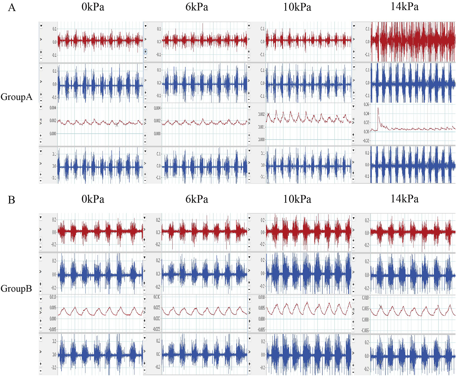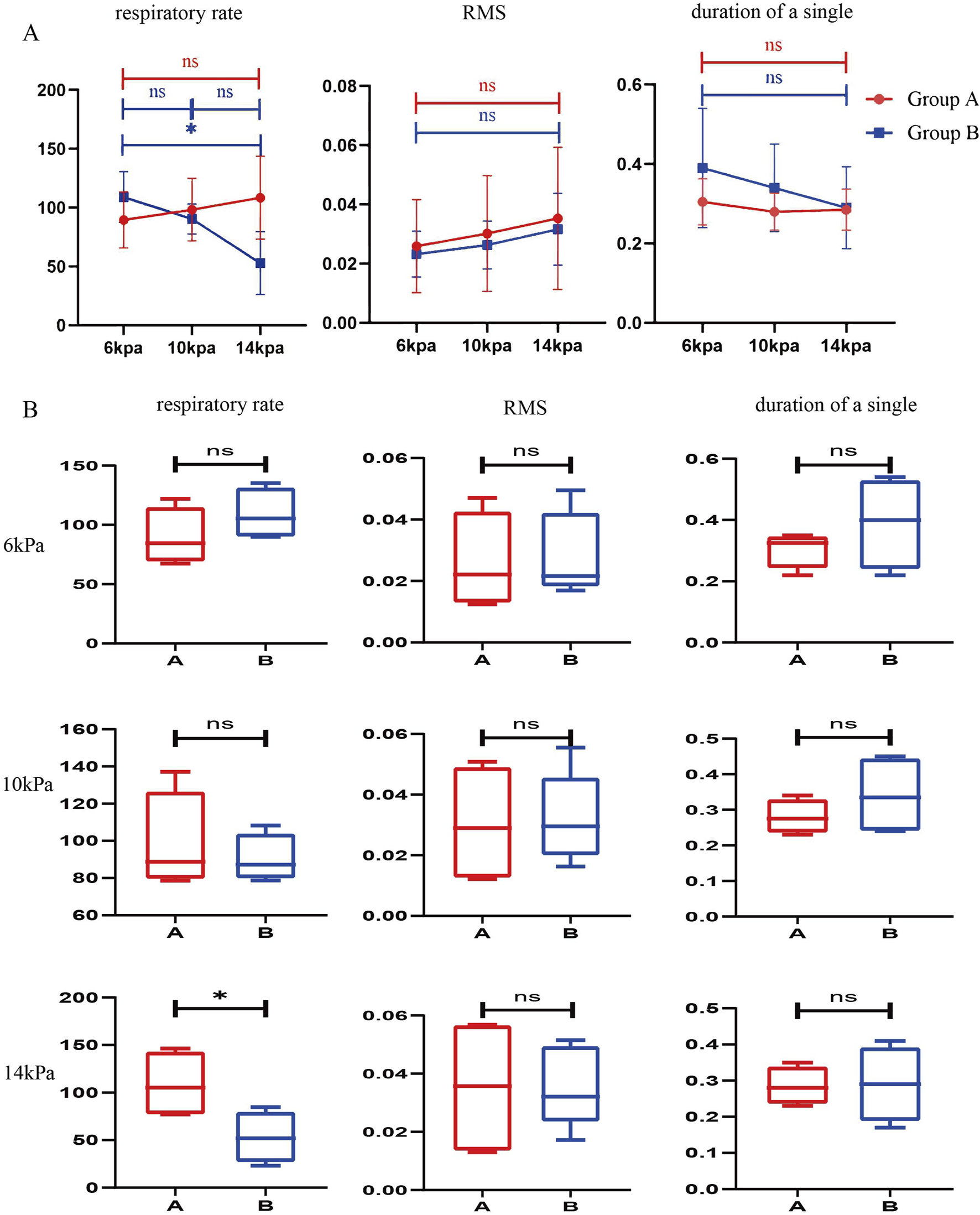 The mean respiratory rate of four rats in group A was (89.59 ± 23.83) bpm at 6 kPa, (98.32 ± 26.59) bpm at 10 kPa, and (108.49 ± 35.31) bpm at 14 kPa, with P = 0.1560 > 0.05, which showed that the respiratory rate of the rats was not related to the changes in perfusion pressure. This data indicates that the respiratory rate of the rat is independent of changes in perfusion pressure when the dura mater is intact. The mean respiratory rate of the four rats in group B was (108.975 ± 21.536) bmp at 6KPa, (90.341 ± 12.761) bmp at 10KPa, and (52.903 ± 26.698) bmp at 14 KPa, P = 0.0130 < 0.05, which was statistically significant, and there was a significant difference. This data indicates that the respiratory rate of the rat decreases with increasing perfusion pressure during dural rupture. The RMS was (0.026 ± 0.016) at 6KPa, (0.030 ± 0.020) at 10KPa, (0.035 ± 0.024) at 14KPa, P = 0.2434 > 0.05, which showed that there was no significant correlation between the RMS and the changes in perfusion pressure. Single diaphragm movement time was (0.305 ± 0.058) seconds at 6KPa, (0.28 ± 0.047) seconds at 10KPa, (0.285 ± 0.052) seconds at 14KPa, P = 0.2823 > 0.05, there was no significant correlation between the time of single diaphragm movement and the change of perfusion pressure. There was no significant correlation between RMS, diaphragm single movement time and perfusion pressure changes (Figure 2B; Table 1).