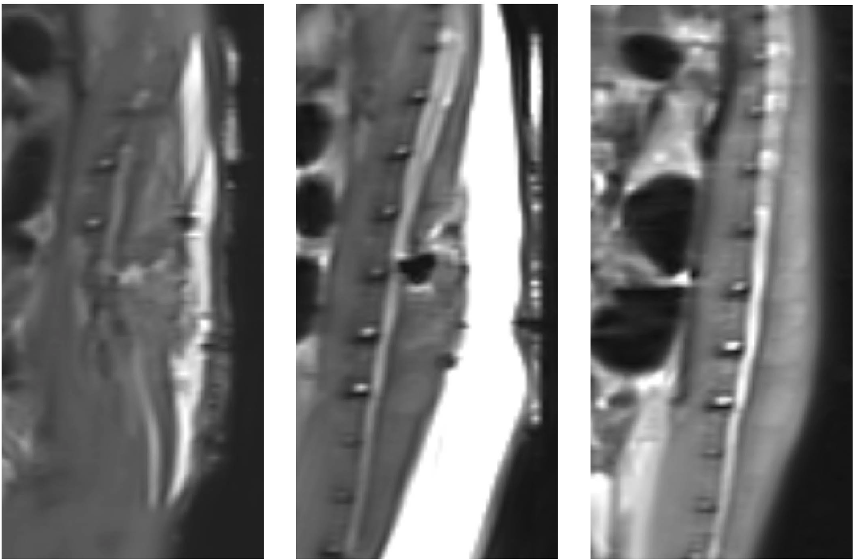 Magnetic resonance imaging results of postoperative rats and preoperative rats (T2): From left to right, the MRI results are shown for rats in group A, rats in group B, and rats that did not undergo surgery.
