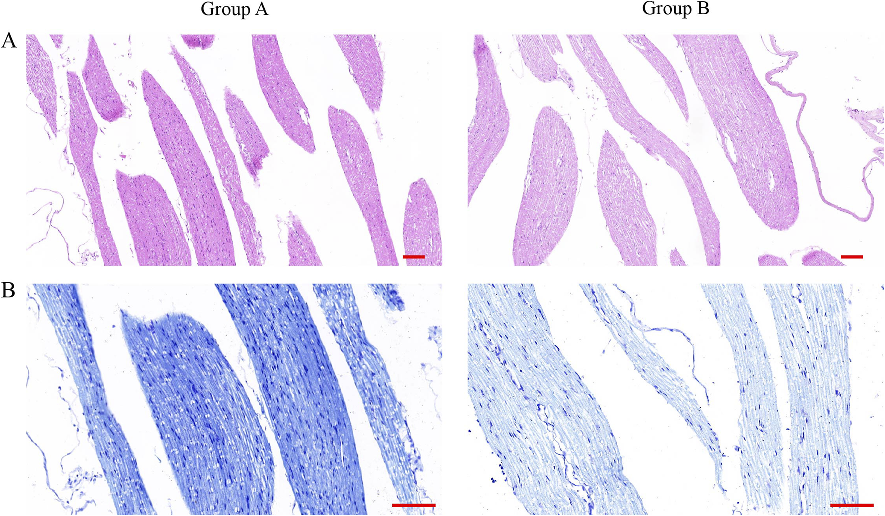 HE staining and toluidine blue staining of spinal cord slices from rats after surgery. (A) HE staining of spinal cord sections of rats in group A and group B. (Scale bar 100 μm). (Scale bar: 100 μm) (B) Toluidine blue staining of spinal cord sections from rats in group A and group B. (Scale bar, 100 μm).