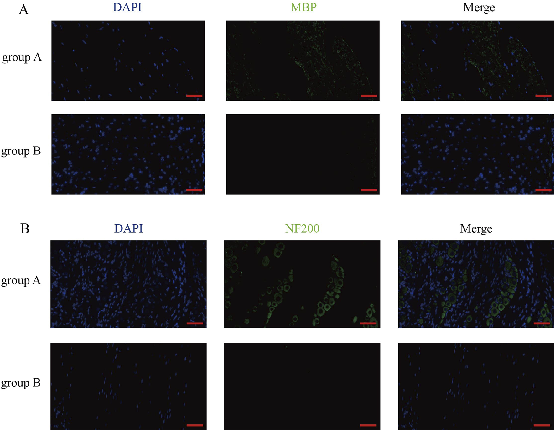 MBP staining and NF200 staining results of rat spinal cord sections after surgery. (A) MBP staining of rat spinal cord sections in group A and group B. (Scale bar, 50 μm). (B) NF200 staining of spinal cord sections from rats in group A and group B. (Scale bar, 50 μm).