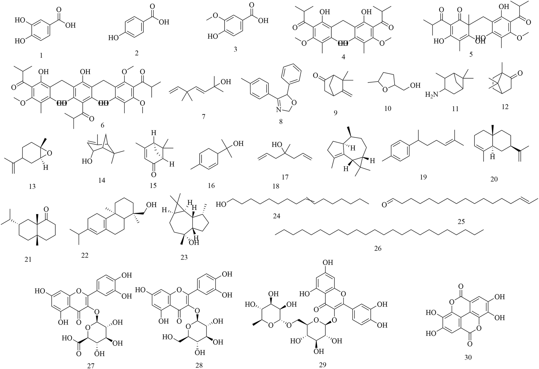 Initial phytochemical investigations concentrated on the flowers of H. abyssinica. In 1990, three phenolic compounds were characterized from H. abyssinica flowers using TLC, LC, UV, IR, MS and NMR spectroscopy, including protocatechuic acid (1), p-hydroxybenzoic acid (2) and vanillic acid (3) (Woldemariam et al., 1990). Subsequently, three phloroglucinol derivatives were systematically isolated from H. abyssinica flowers, which were identified as alpha-kosin (4), kosotoxin (5) and protokosin (6) (Woldemariam et al., 1992). In 2010, twenty compounds were characterized from the essential oils of H. abyssinica flowers using GLC/MS analysis, including yomogi alcohol (7), 2,5-dihydro-5-(4-methylphenyl)-4-phenyl-oxazole (8), 6-camphenone (9), tetrahydro-5-methyl-2-furanmethanol (10), 3-pinanylamine (11), L-camphor (12), trans-limonene oxide (13), verbenol (14), cis-Verbenone (15), α-phellandren-8-ol (16), diallyl methyl carbinol (17), gurjunene (18), curcumene (19), α-selinene (20), valeranone (21), palustrol (22), ledol (23), 9-hexadecen-1-ol (24), E-15-heptadecenal (25), and tetracosane (26). Of these, ledol (23) was the main chemical component, accounting for 58.57% (Nibret and Wink, 2010). In 2012, three flavonoids and one phenolic acid were systematically isolated from the flowers of H. abyssinica and they were identified as quercetin 3-O-β-glucuronide (27), quercetin 3-O-β-glucoside (28), rutin (29) and ellagic acid (30) (Thomsen, 2012) (Figure 2).