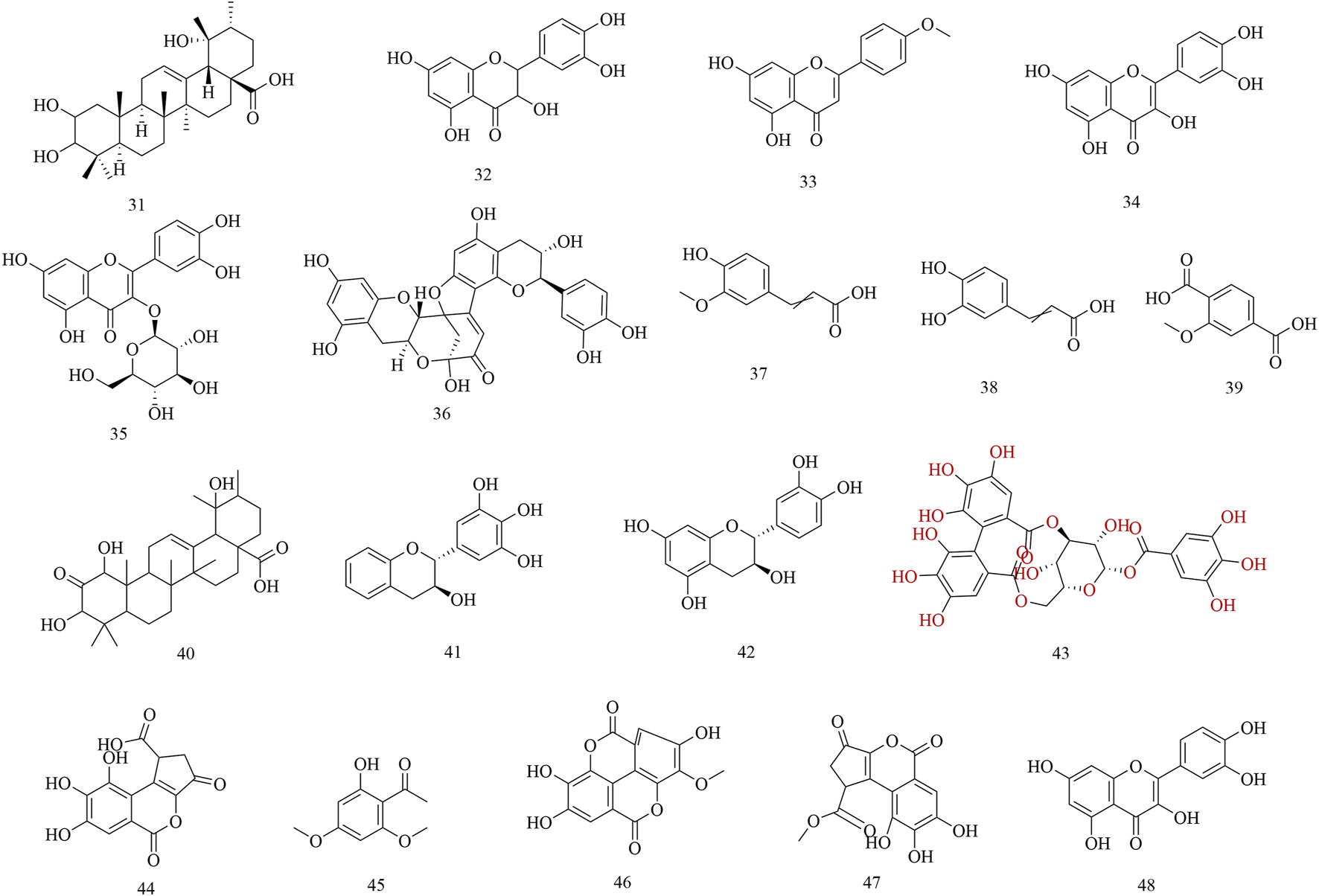 Subsequently, phytochemistry researchers isolated some secondary metabolites from the roots, leaves, and barks of H. abyssinica. For example, a pentacyclic triterpene, 2, 3, 19-trihydroxyurs-12-en-28-oic acid (31), was isolated from the leaves of H. abyssinica and its chemical structure was elucidated by one- and two-dimensional NMR. Five flavonoids, dihydroquercetin (32), acacetin (33), quercetin (34), isoquercitin (35), dehydrodicatechin A (36); and four phenolics, trans-ferulic acid (37), caffeic acid (38), protocatechuic acid (1), and 2-methoxyterephthalic acid (39); were systematically isolated from the roots of H. abyssinica (Fan et al., 2020). One triterpenoid, 1,3,19-trihydroxy-2-oxo-12-ursen-28-oic acid (40) and two flavans, 3,3′,4′,5′-tetrahydroxyflavan (41) and 3,3′,4′,5,7-pentahydroxyflavan (42) were separated from the barks of H. abyssinica and their chemical structures were elucidated by NMR and MS spectroscopy (Wagara et al., 2023). UPLC-MS coupled with molecular docking revealed compounds for the treatment of parasitic diseases, including corilagin (43), brevifolin carboxylic acid (44), brevifolin (45), methyl ellagic acid (46), methyl brevifolin carboxylate (47), and quercetin (48) (Fan et al., 2024) (Figure 3).
