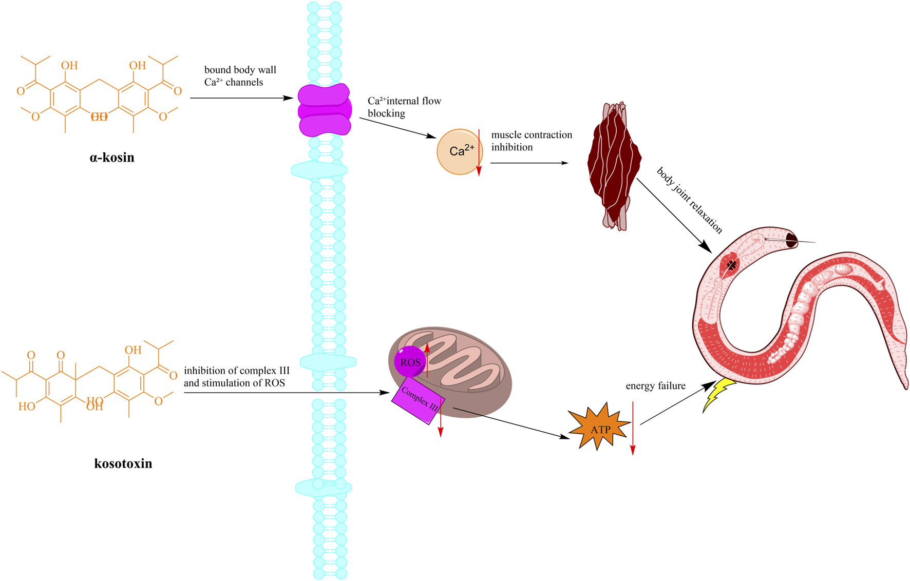 Figure 5. Schematic diagram of the mechanism of anthelmintic action of H. abyssinica. (Note: The active ingredient causes worm muscle paralysis (tapeworm segment contraction) and content leakage by interfering with parasite Ca2+ channels and inhibiting mitochondrial electron transport chain complex III).