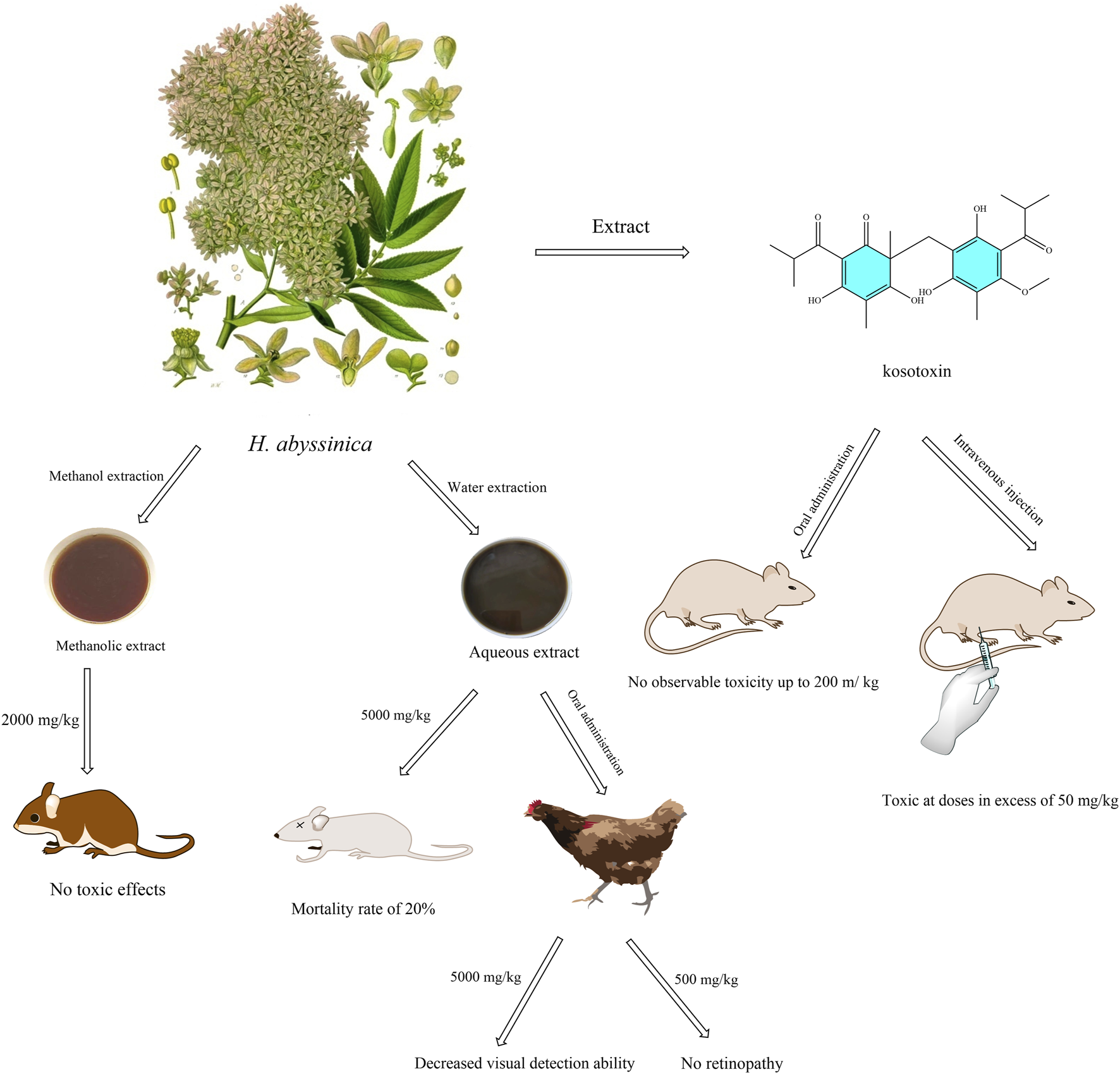Figure 6. Illustration of the in vivo toxicity of extracts and compound of H. abyssinica. (This figure depicts the toxicity assessment of extracts (methanolic and aqueous extracts) and the compound kosotoxin of H. abyssinica. Mice were unaffected at a concentration of 2,000 mg/kg in the methanol extract, but mortality was 20% at 5,000 mg/kg in the aqueous extract. Chickens had reduced visual acuity at 5,000 mg/kg extract (no retinopathy at 500 mg/kg extract). Kosotoxin was not toxic to mice when administered orally at ≤200 mg/kg, but was toxic when administered intravenously at >50 mg/kg).