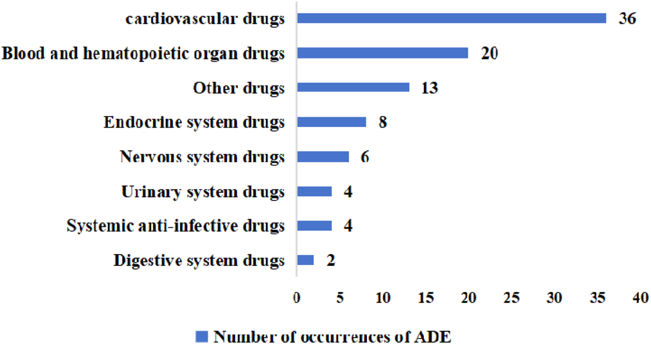 Categorizing the drugs involved, the highest number of ADE cases occurred in the cardiovascular drugs, involving 16 drugs such as spironolactone, furosemide, digoxin, torasemide, etc., with a total of 36 cases, accounting for 38.71% (36/93). The next type was blood and hematopoietic organs drugs with 20 cases, accounting for 21.51% (20/93), and the main drugs involved were clopidogrel sulfate tablets, warfarin, and heparin. In third place was other types, involving drugs such as potassium chloride and vitamin K1 injection in 14 cases or 13.98% (13/93). There were also drugs involving the endocrine system in 8 cases, the nervous system in 6 cases, systemic anti-infectives and the urinary system in 4 cases each, and the digestive system in 2 cases (Figure 2).