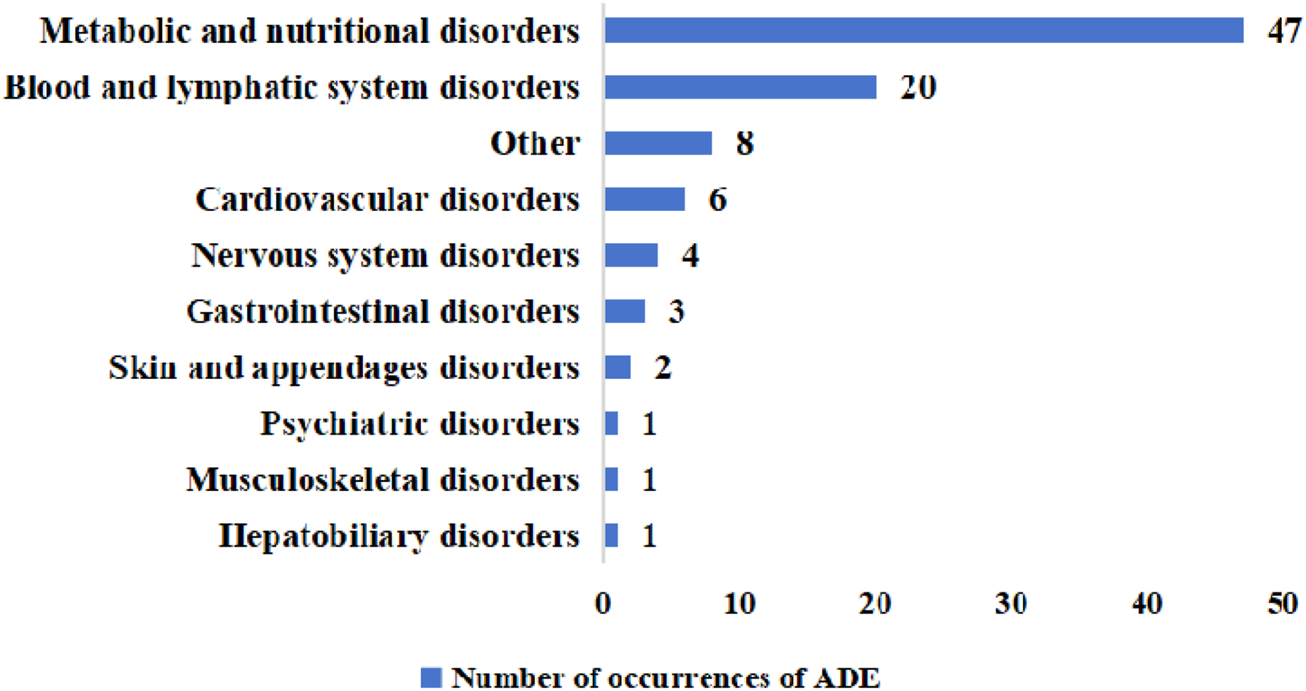 In this study, the highest occurrence of ADE involving organ-systems was metabolic and nutritional disorders with 47 cases accounting for 50.54% (47/93), which included hypokalemia, hyperkalemia, hyponatremia, hypernatremia, hypoglycemia, and renal dysfunction. This was followed by hematologic and lymphatic system including leukopenia, thrombocytopenia and coagulation disorders that occurred in 20 cases that accounted for 21.51% (20/93). Other types of edema occurred third with 8 cases representing 8.60% (8/93). Cardiovascular system occurred in 6 cases, gastrointestinal damage in 4 cases, neurological damage in 3 cases, skin and its accessories in 2 cases, and hepatobiliary, psychiatric, and musculoskeletal damage in 1 case each (Figure 3).