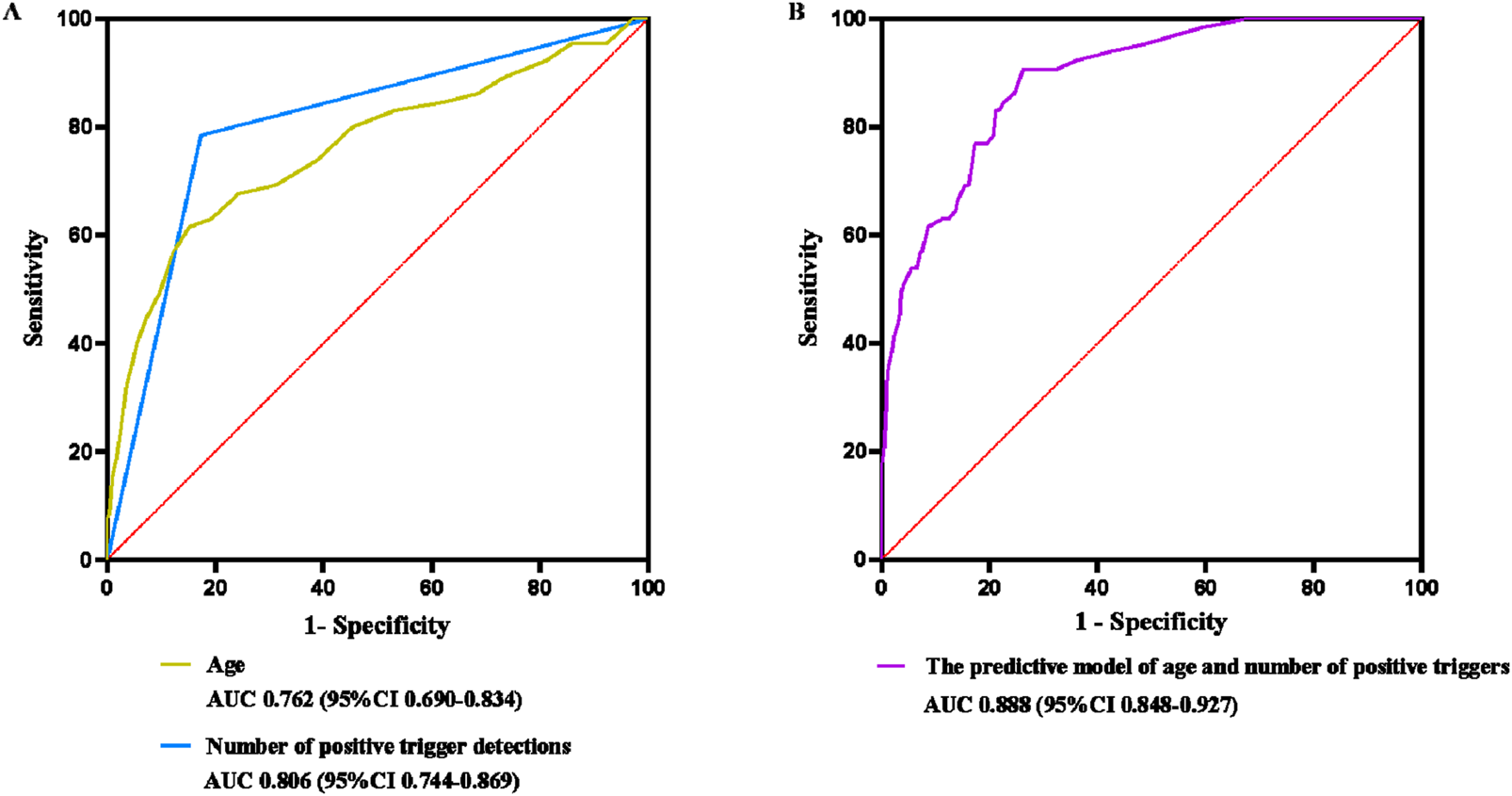 The two risk factors: age and the number of positive trigger detections, were used to predict the optimal equation using the ROC curve. The results of the predictive model showed that AUC = 0.888 (95%CI: 0.848–0.927). AUC >0.75 indicates that the model shows good discrimination (Figure 4).