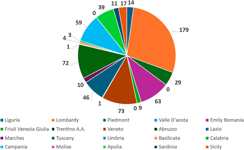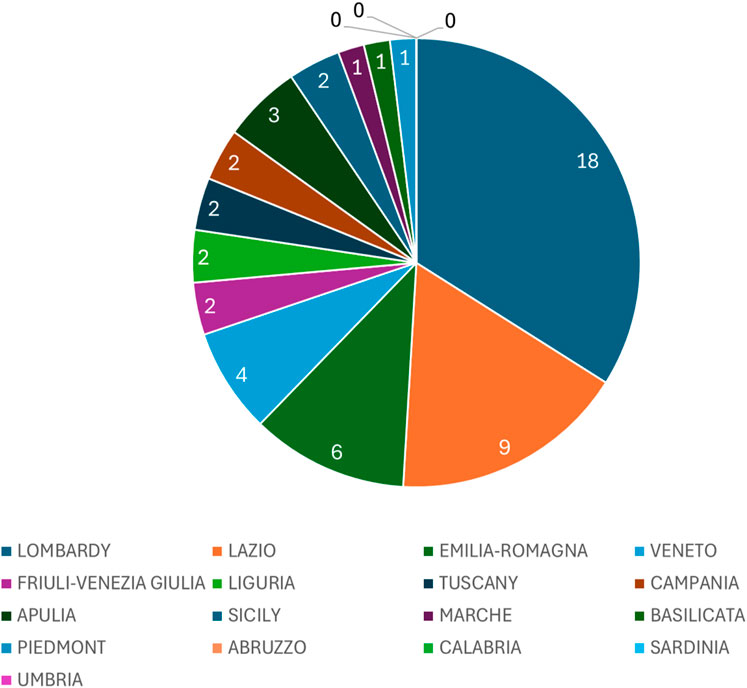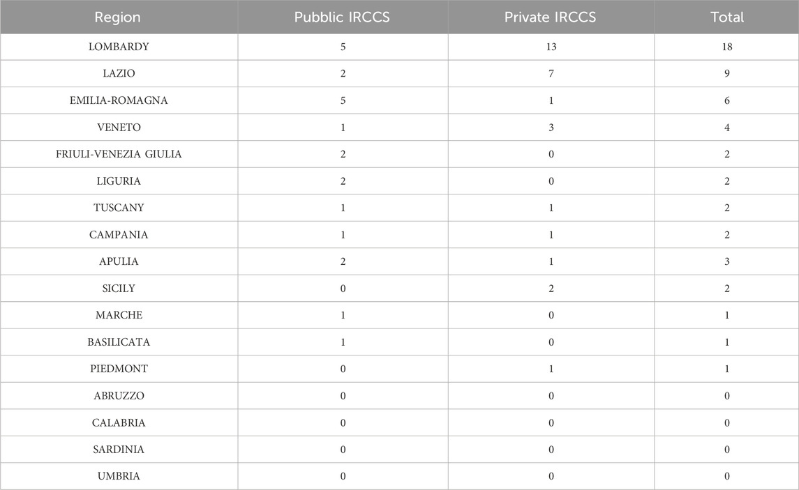 Figure 4. Pie chart illustrating the distribution of IRCCS (public and private) across Italian regions. Each slice represents the total number of IRCCS (Istituti di Ricovero e Cura a Carattere Scientifico) facilities present in each region, reflecting their territorial concentration.