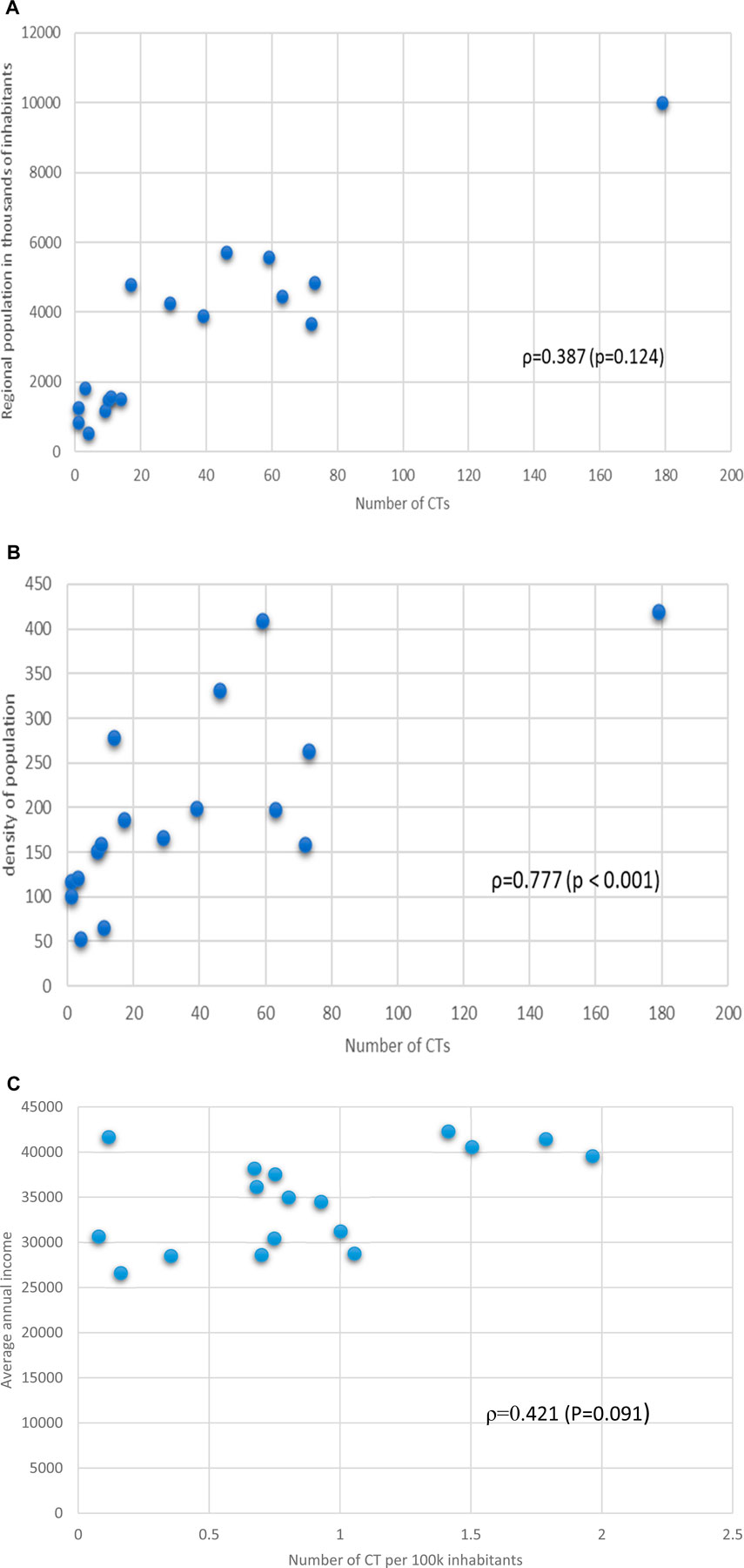 Figure 2. (a) Relationship between regional population in thousands of inhabitants and number of the number of CTs. Spearman’s association value and p value are shown. (b) Relationship between density of regional population and number of CTs per Region. Spearman’s association value and p value are shown. (c) Relationship between Regional average annual income and number of CTs per Region. Spearman’s association value and p value are shown.