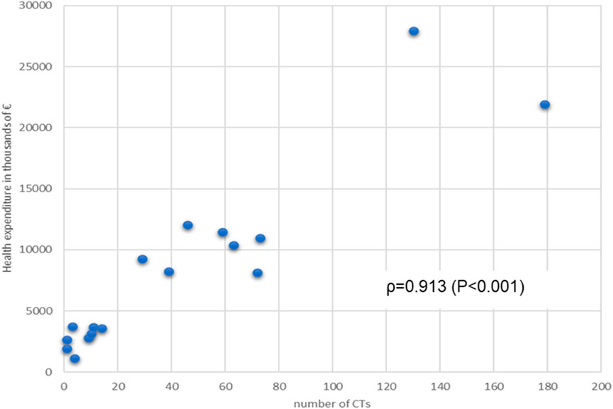 We determined the association data between the number of CTs and the macroeconomic parameters related to RHS, with the following results: RHS expenditure vs. number of CTs ρ = 0.913 (p < 0.001) (Figure 3), and number of CTs vs pharmaceutical expenditure (ρ = 0.036, p = 0.891) (graphs not shown).