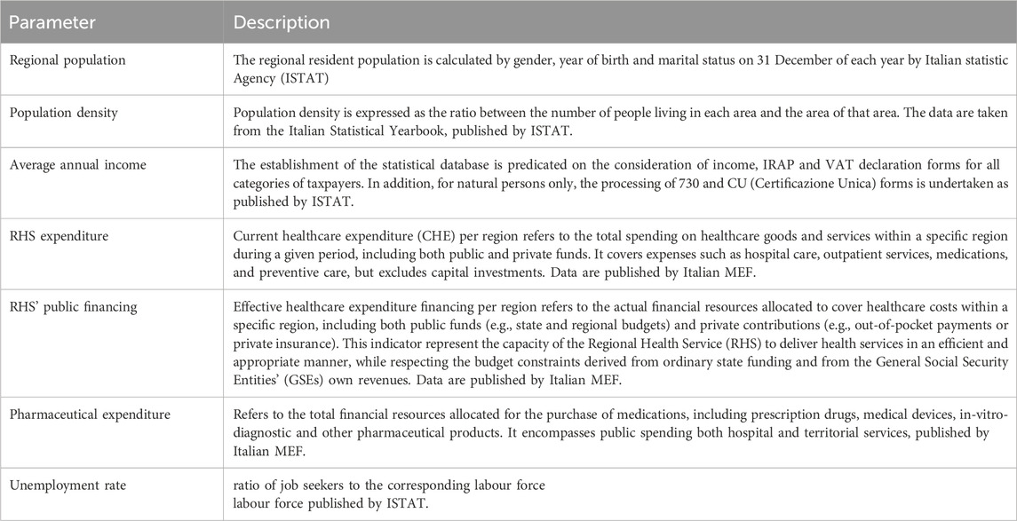 Table 1. Overview of key socio-economic and healthcare-related parameters used to analyse regional disparities in Italy. CU: official document that summarizes an individual’s income and tax-related information for a specific fiscal year; ISTAT: Italian Statistics Agency, MEF: Ministry of Economic and Finance.