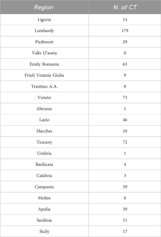Table 3. The table provides an overview of the regions in Italy, grouped by area (North-West, North-East, Center, South, and Islands). N.b.: Valle d'Aosta, Trentino-Alto Adige, and Molise are not included in the dataset, because does not have any CT activated. CT: Clinical trial.