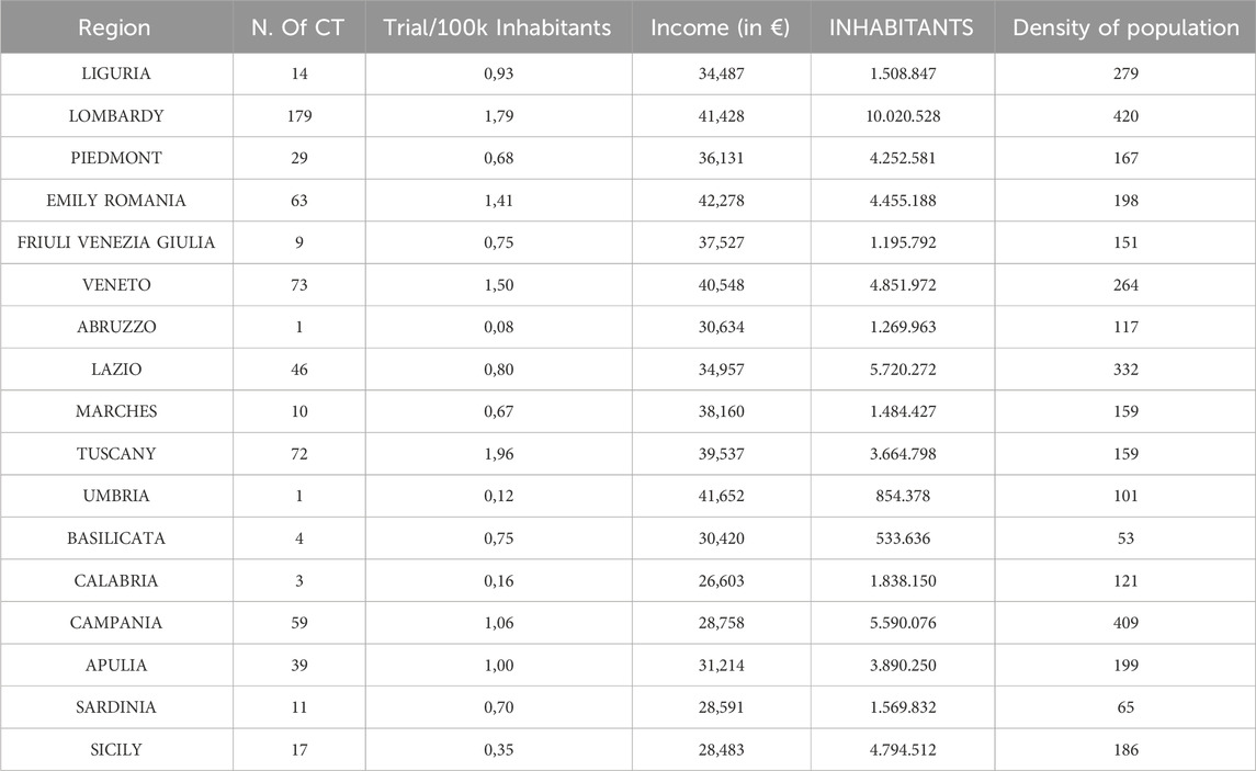 As far as the descriptors of the economic capacity of the territory are concerned, the parameter of annual wealth produced (2022 data), assessed by individual region, was used (Supplementary Material, Table 3). For each Italian region, we tabulated the average annual income, the number of inhabitants, the area of the region and the number of active CTs. From these data, we calculated the ratio between the number of CTs and the resident population, expressed as number of trials/100k inhabitants. Also, the population density, expressed as number of inhabitants per km2 of regional area was calculated. Data are shown in Table 3.