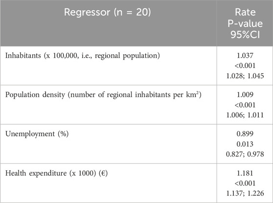 The findings highlight the critical role of regional demographics and healthcare investment in influencing the outcome. Population size and density likely reflect broader sociodemographic dynamics, such as resource demand or transmission opportunities (if the outcome is disease-related). Health expenditure’s robust association may signal the importance of infrastructure or access to services. Unemployment’s negative effect could imply economic stressors reducing the likelihood of the outcome or confounding factors (e.g., migration patterns). Notably, the IRRs for scaled predictors (population, health spending) require careful interpretation to avoid overestimating effects. While the model identifies significant predictors, limitations include a small sample size (n = 20), which may affect generalizability. Future studies could validate these associations with larger datasets and explore contextual factors, such as regional policies or environmental variables, to refine causal interpretations. These results hold policy relevance, particularly for prioritizing healthcare funding and addressing unemployment’s indirect impacts on public health or economic outcomes.